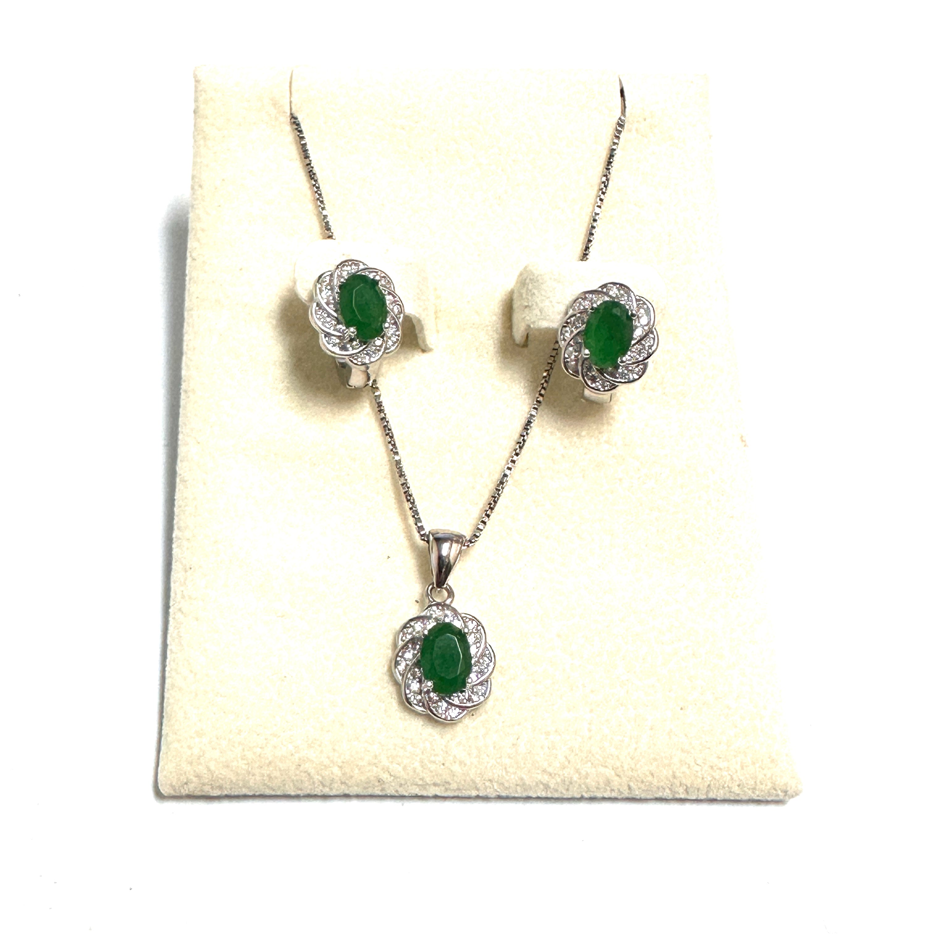 Sterling Silver Rhodium Plated Lab Grown Emerald and CZ Earrings Pendant Set