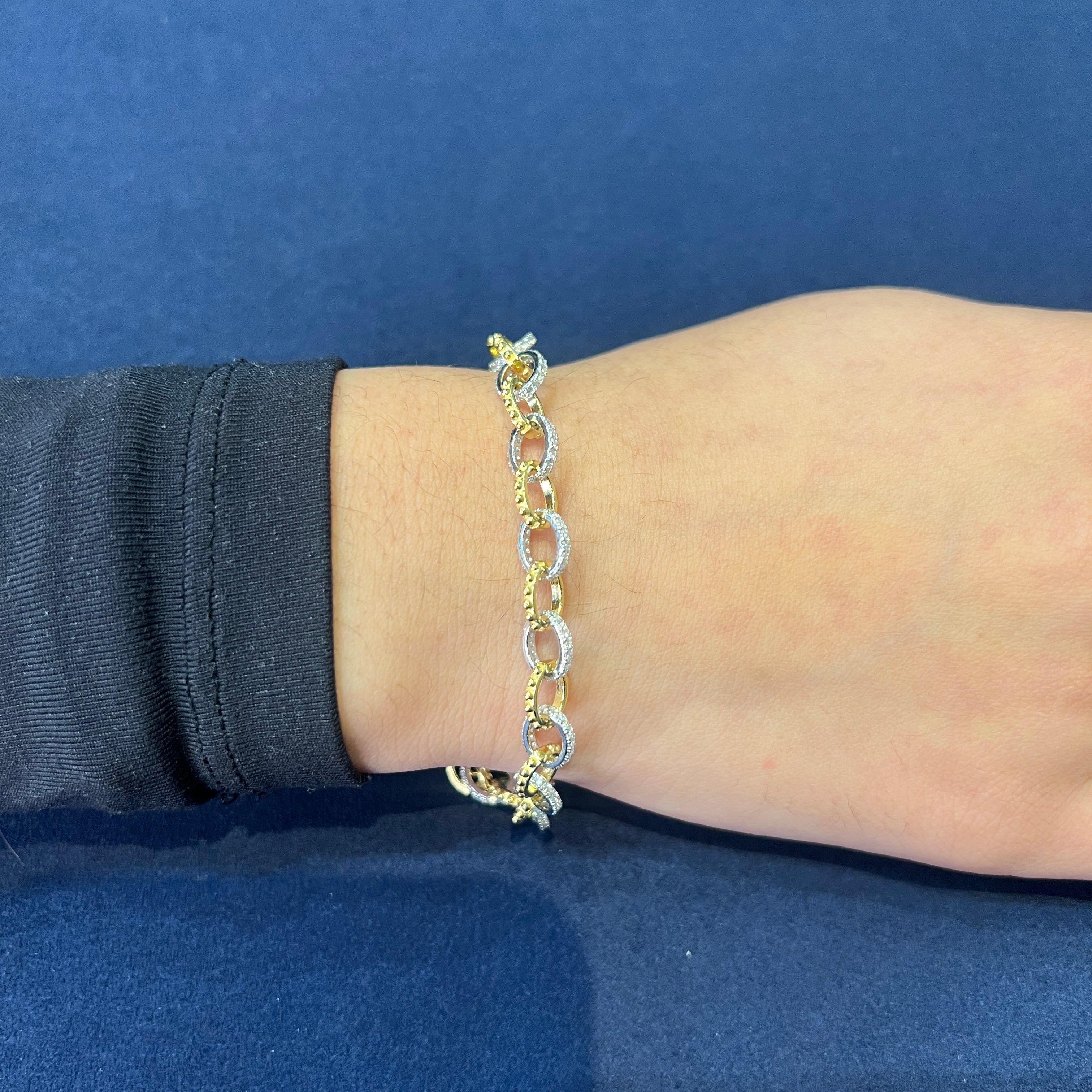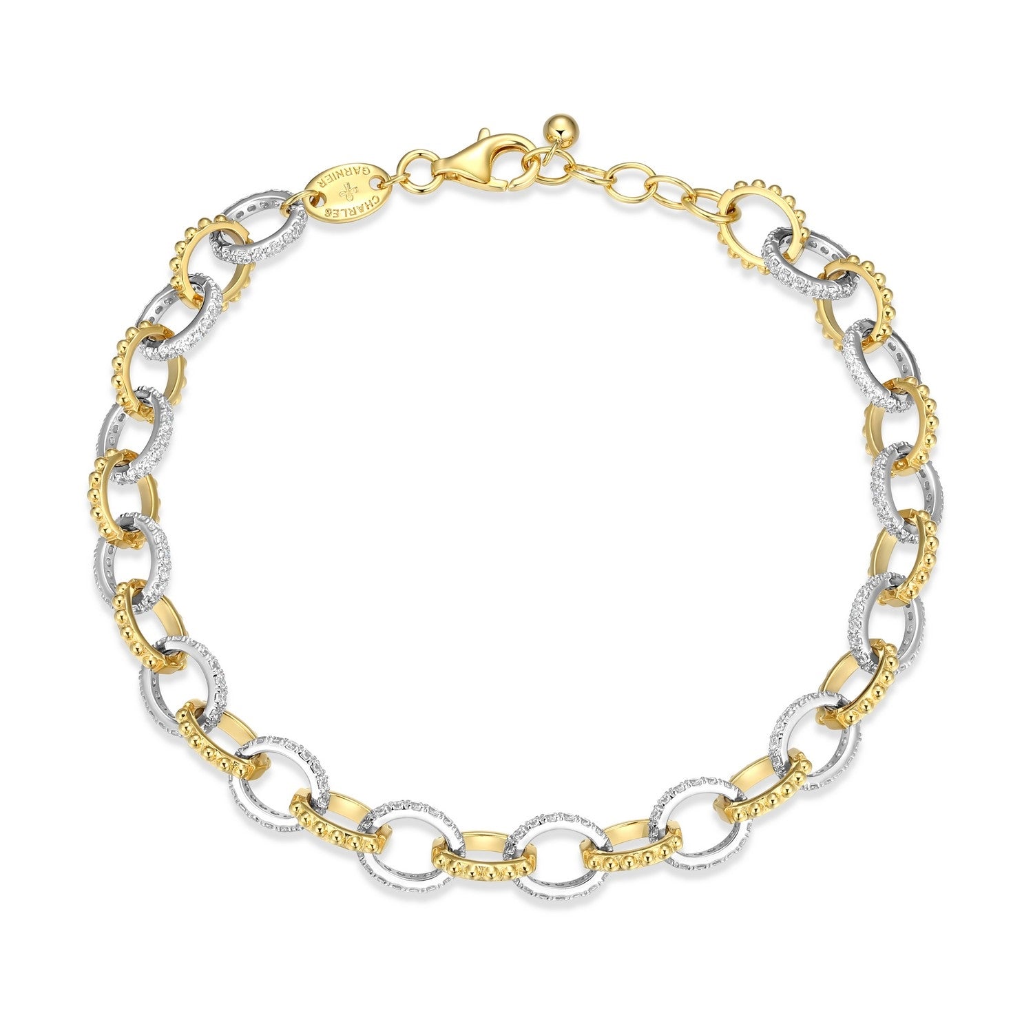 Crafted with elegance and modern flair, this sterling silver fancy link bracelet showcases a stunning two-tone design with gold and rhodium plating. The textured links are highlighted by brilliant cubic zirconia accents, adding sparkle and sophistication to any ensemble. Perfect for both everyday wear and special occasions, this bracelet offers a timeless touch of luxury.