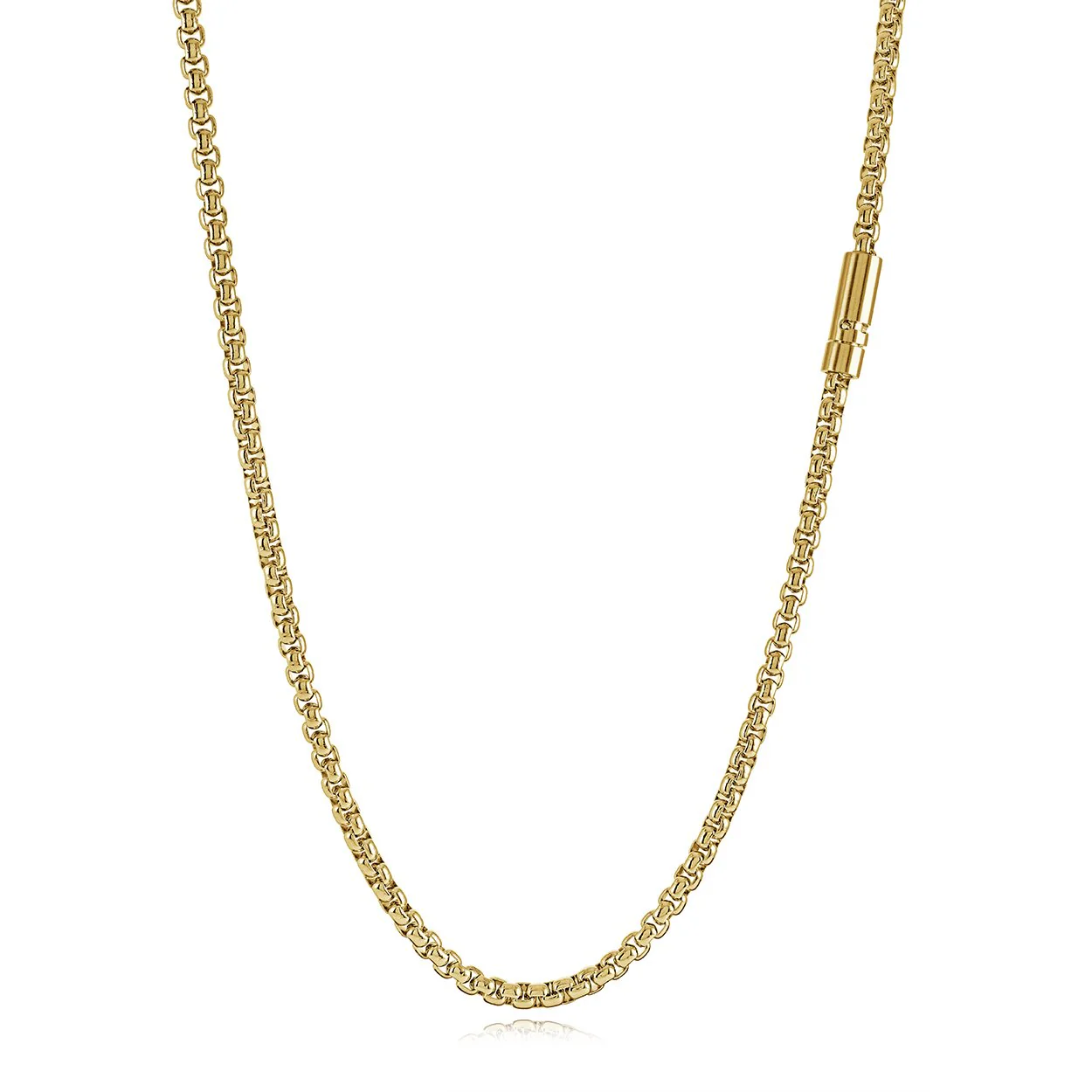 This 4mm box link chain is crafted in stainless steel with a rich gold-plated finish for lasting shine. Designed with a modern matte clasp, it offers both durability and a sleek edge, making it perfect for wearing solo or paired with a pendant.