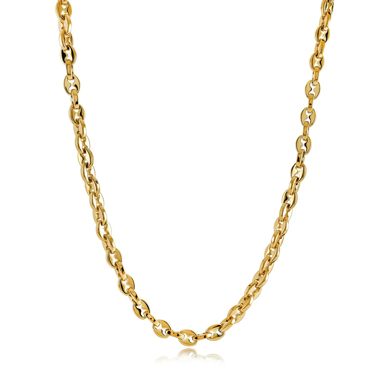 This 6mm bean link chain is crafted in durable stainless steel with a rich gold-plated finish. The smooth, rounded links offer a sleek, modern look while maintaining everyday strength and wearability. Perfect worn solo or layered with other chains for added style.