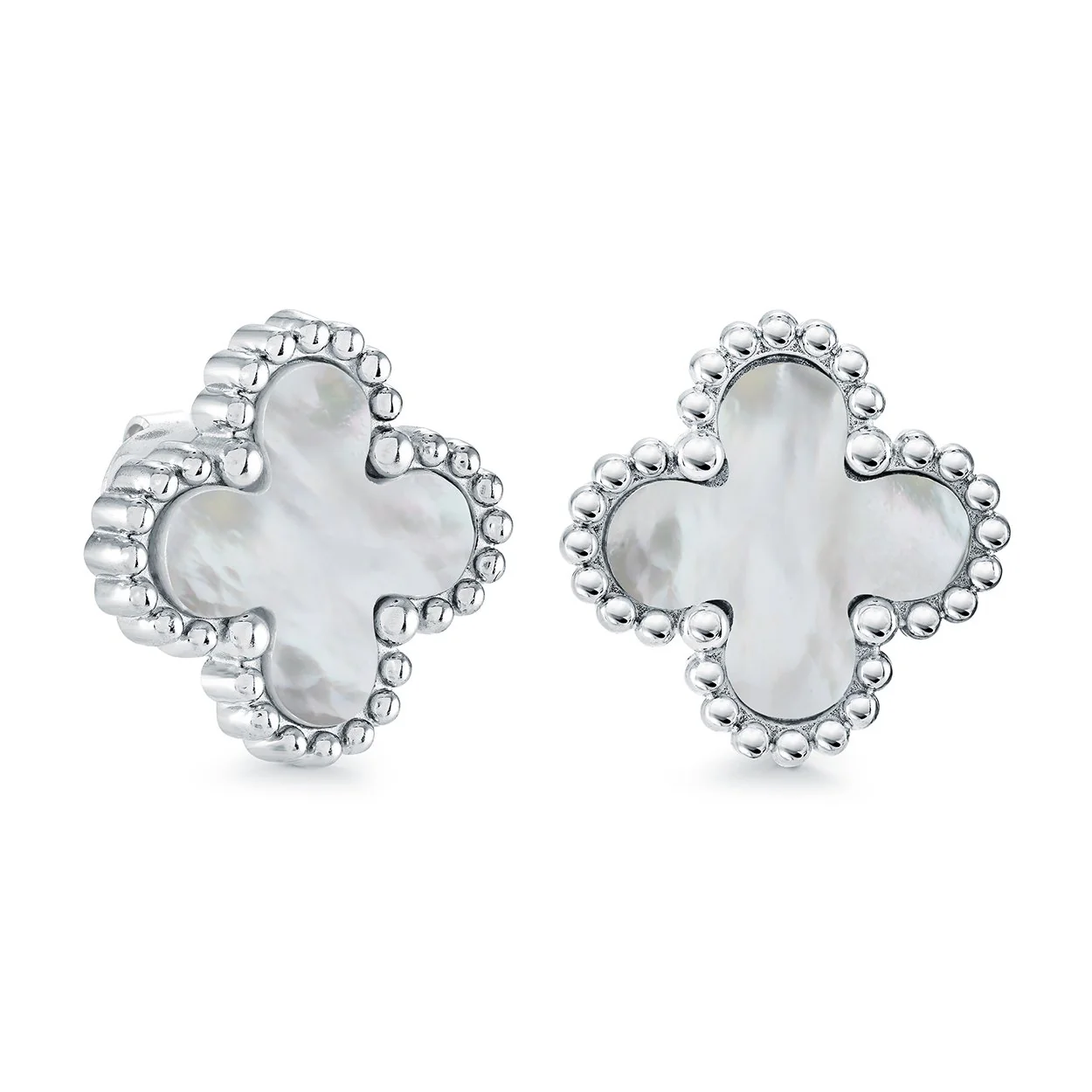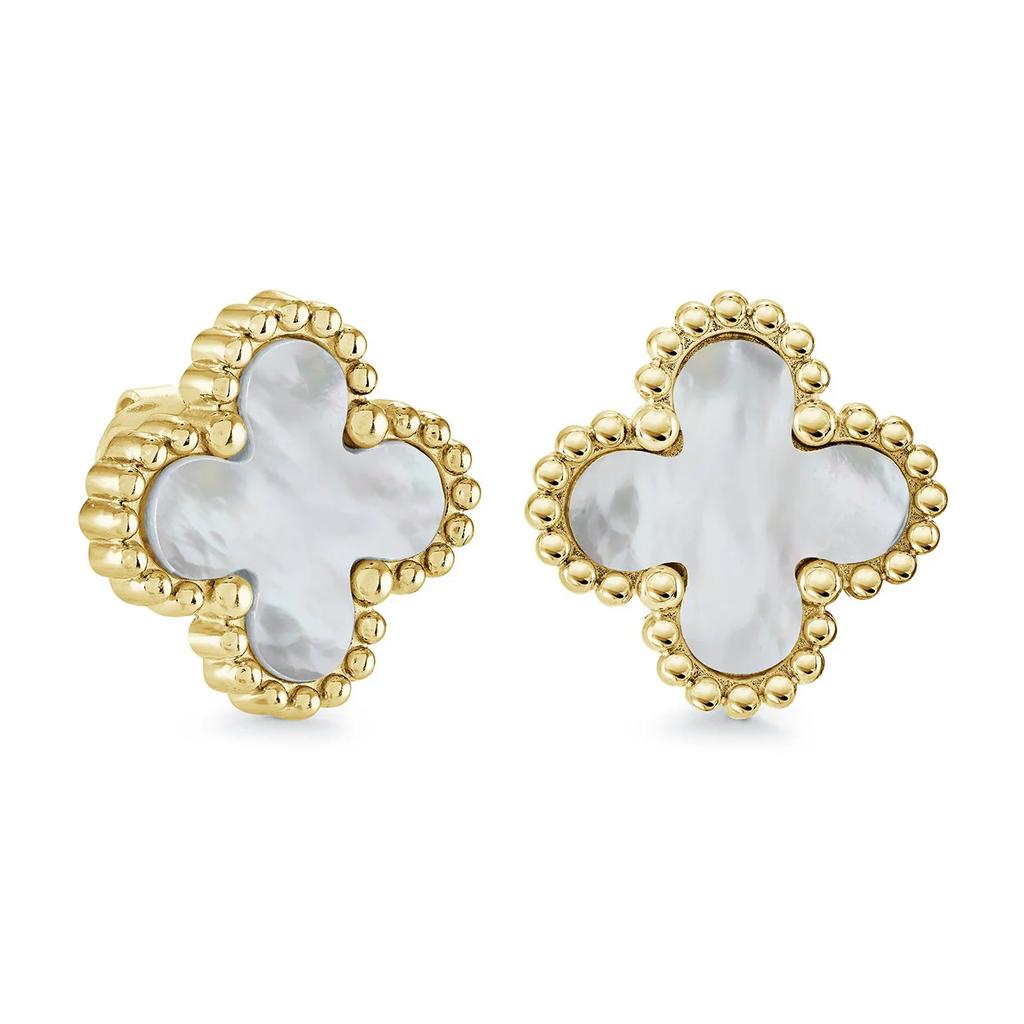 Graceful and refined, these stainless stell or gold plated stud earrings feature 13mm clover-shaped mother of pearl inlays surrounded by delicate beaded detailing. A stylish blend of classic luck and subtle texture—perfect for elevating any look.