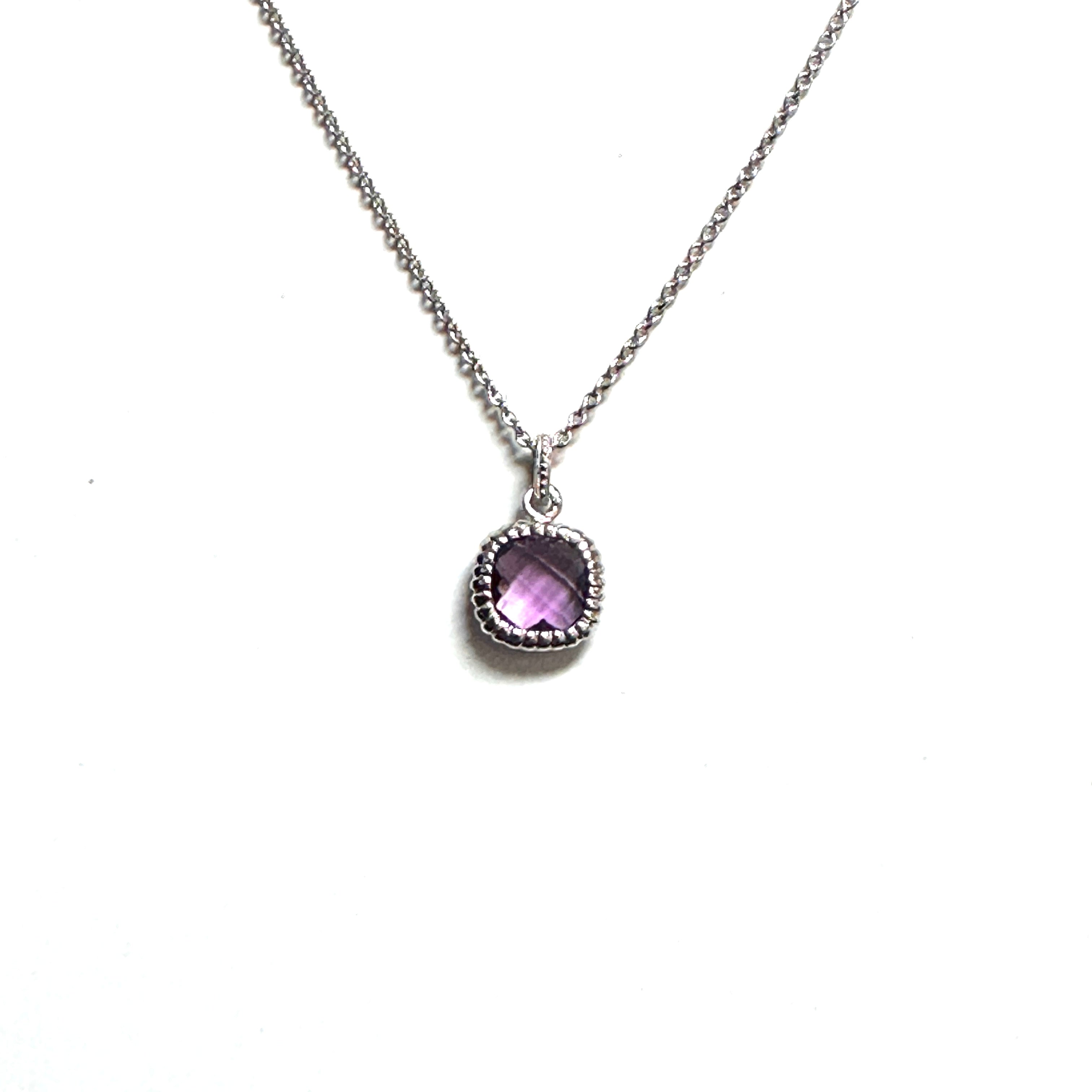 This sterling silver cushion-cut gemstone pendant showcases a stunning 7mm genuine amethyst set in a sleek, polished silver frame. Its rich purple hue and timeless design make it a perfect piece for adding elegant color to any look.