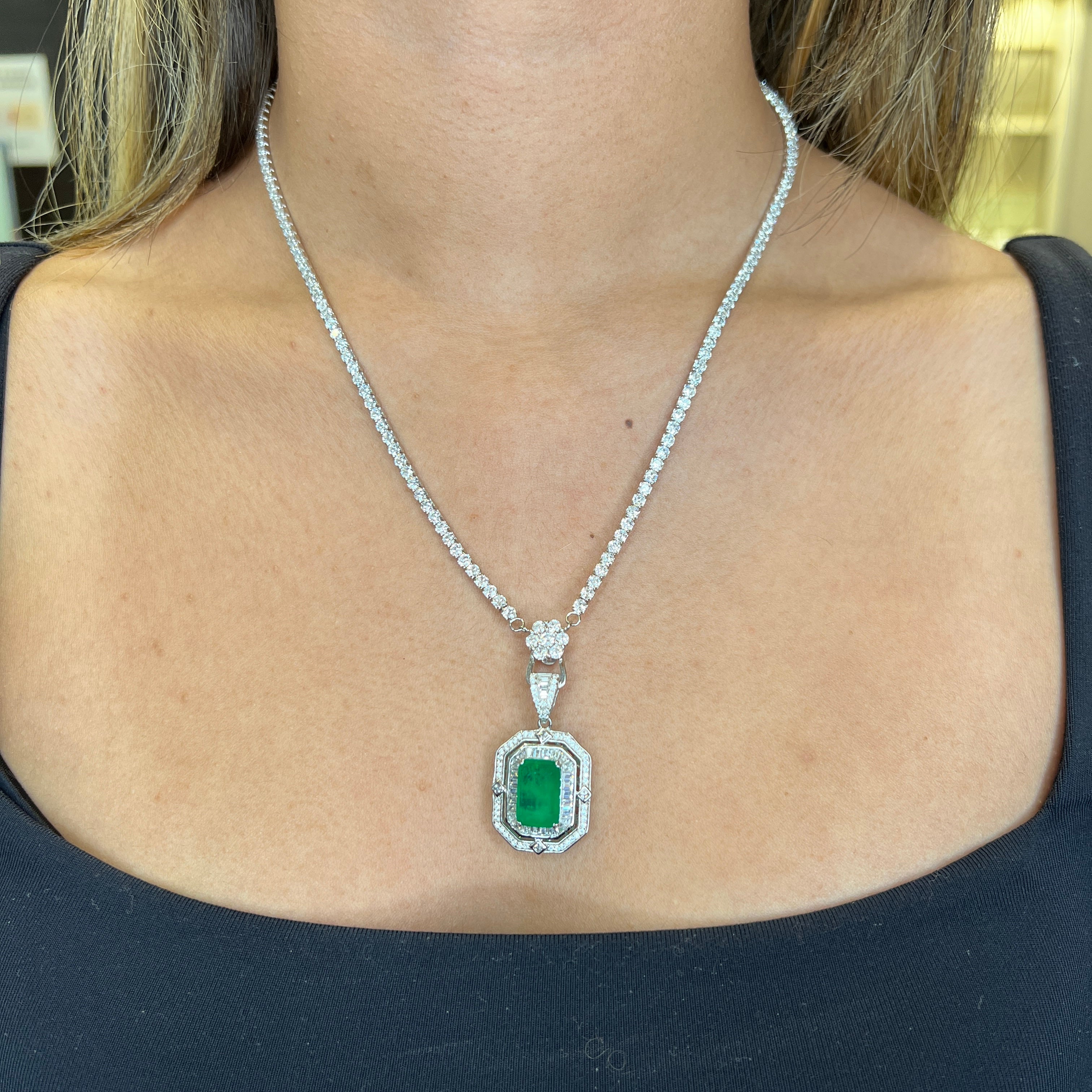 This necklace showcases a vibrant lab-grown emerald accented by sparkling cubic zirconia. The rhodium-plated finish enhances brilliance and durability, creating an elegant necklace perfect for everyday wear or special occasions.