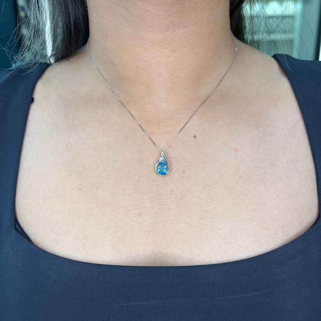 10K White Gold Pear Shape Blue Topaz and Diamond Pendant