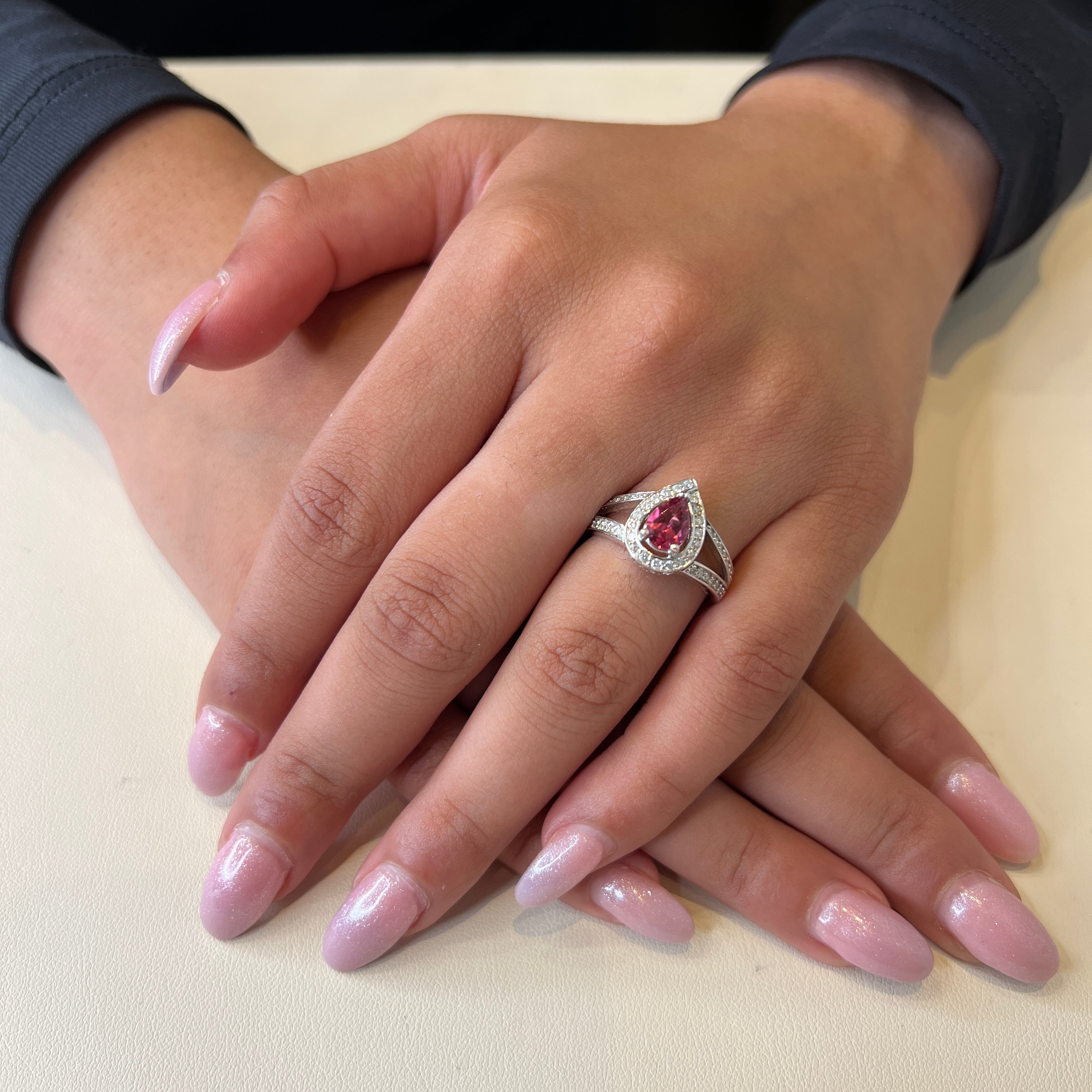 14K White Gold Pear Shape Pink Tourmaline and Diamonds Ring