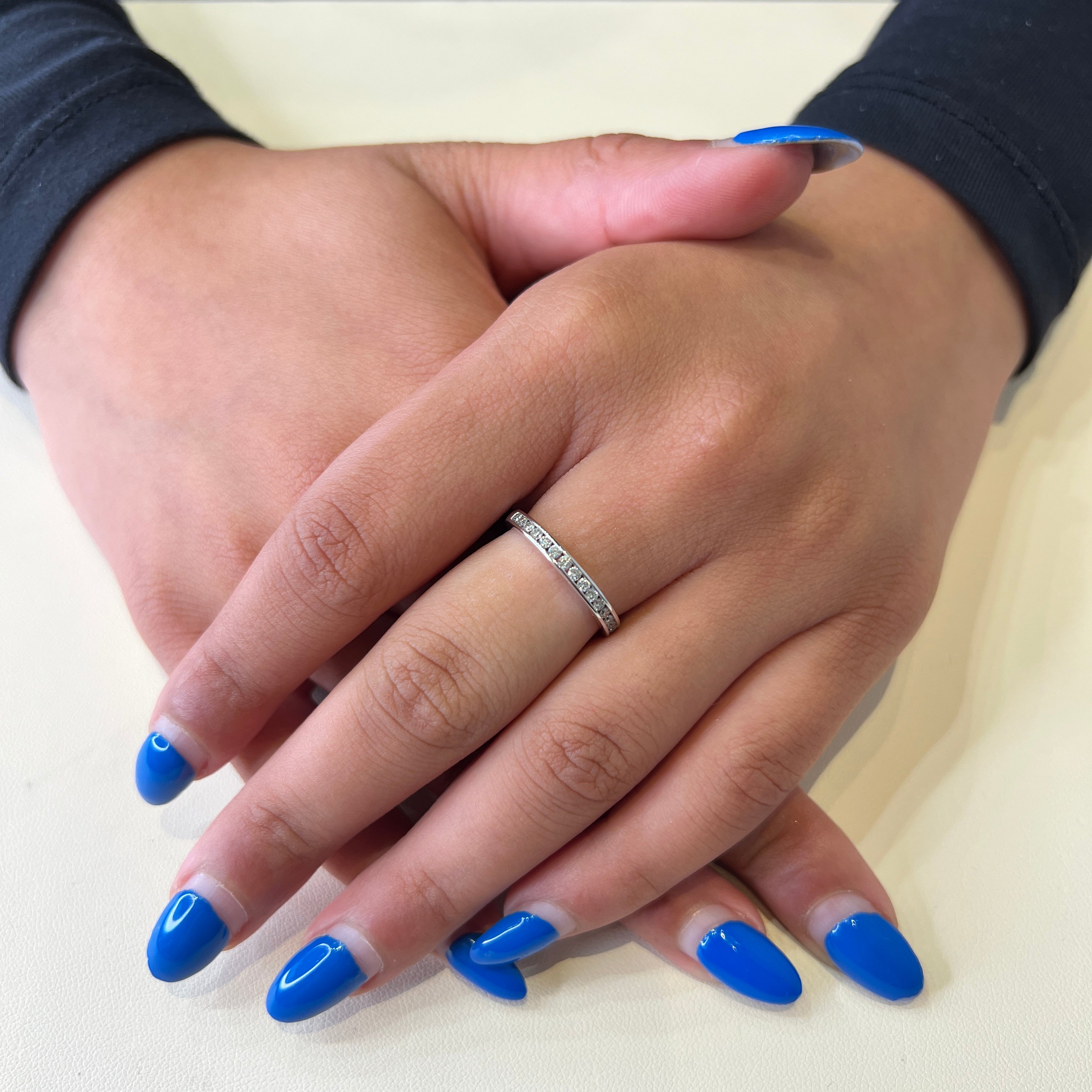 Crafted in lustrous white gold, this band features a seamless row of channel-set cubic zirconia stones, creating a sophisticated and dazzling appearance. Perfect for adding a touch of glamour to any outfit.