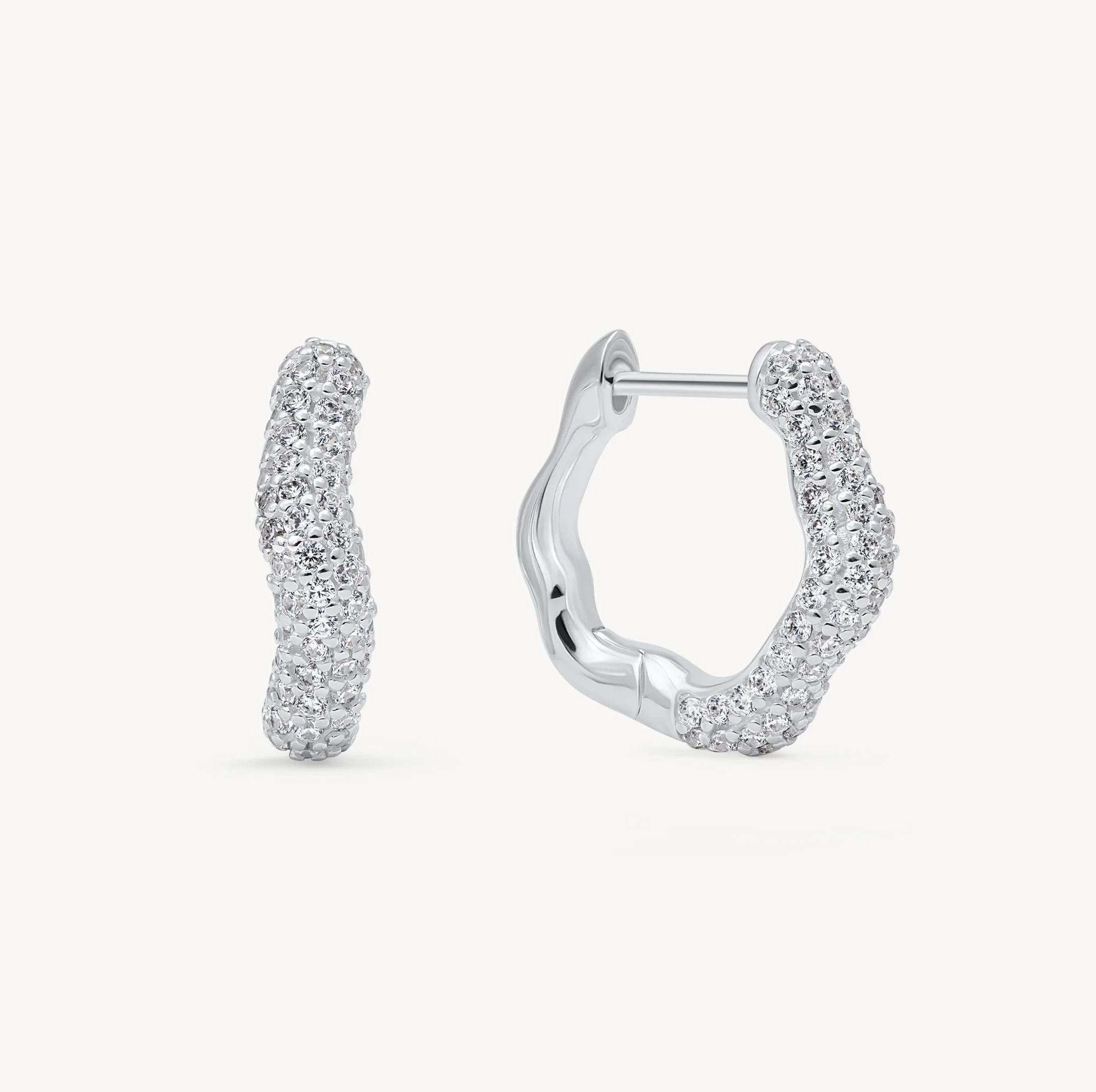 Sculptural and endlessly versatile, the Nova Wave Hoops balance light and movement in a softly curved silhouette. Available in sterling silver or 14k gold vermeil over sterling silver, each reversible hoop features a polished metal finish on one side and hand-set white cubic zirconia on the other. The hinge-and-click closure ensures a seamless, secure fit. Designed to flow effortlessly from day to night, these 18mm hoops bring modern elegance—and a touch of energy—to every look.