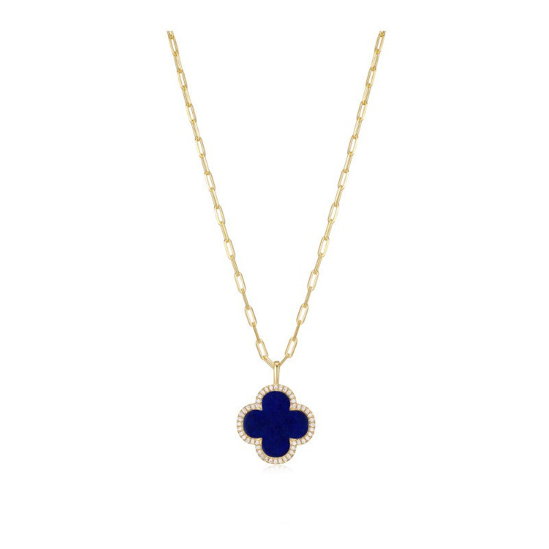 A stylish and vibrant necklace from Charles Garnier’s “Bliss” collection, expertly combining classic materials and eye‑catching design. This piece features a 16 mm clover‑shaped lapis lazuli inlay accented with sparkling cubic zirconia stones, all set in sterling silver with a yellow gold vermeil (18K gold‑plated) finish for a bright, polished look.
