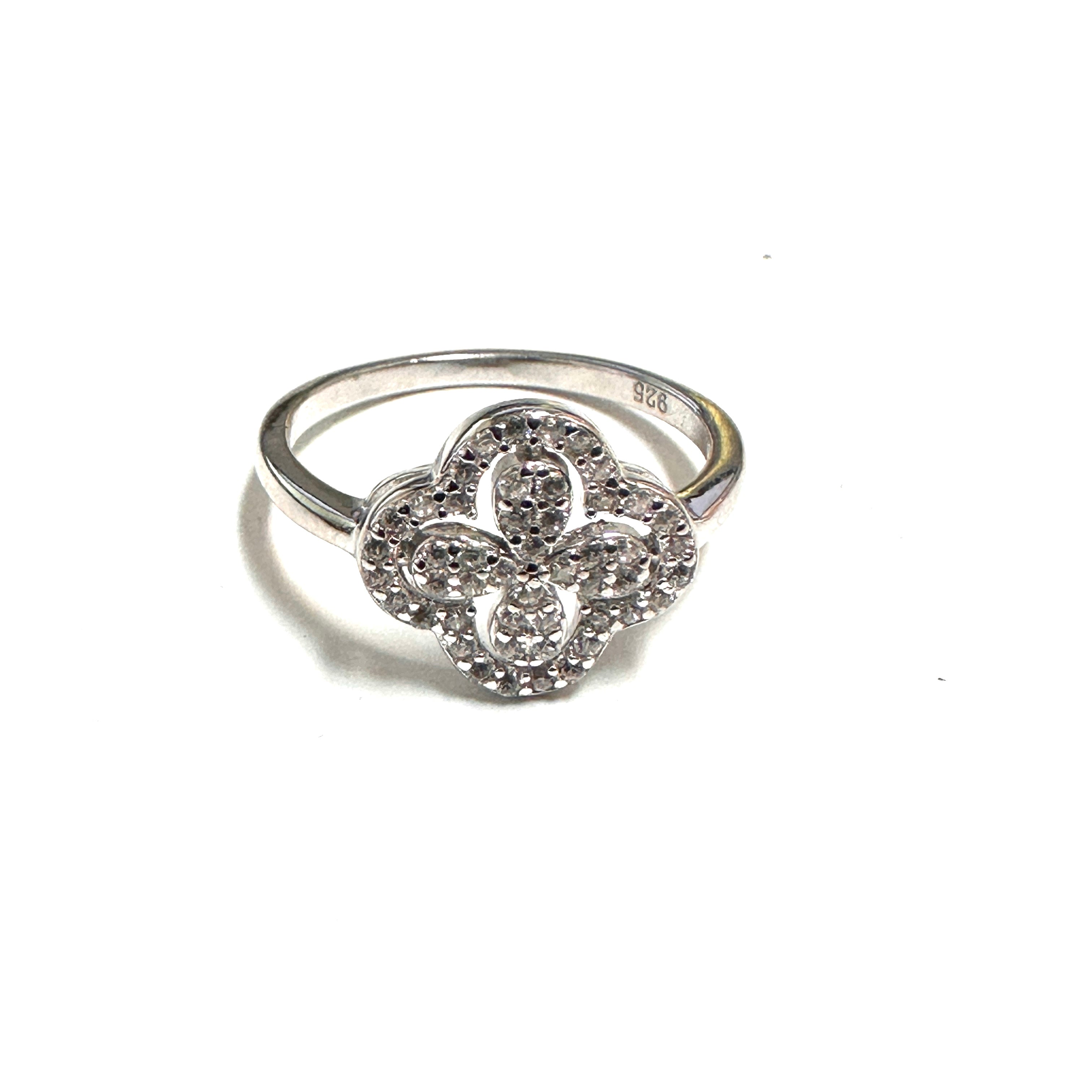 This is a graceful and stylish piece of jewelry made from sterling silver with a rhodium plating that gives a bright, lustrous finish and helps resist tarnishing. The design features sparkling cubic zirconia stones arranged in a floral motif, creating a feminine, nature-inspired look. This ring combines classic elegance with eye-catching sparkle, making it perfect for everyday wear or as a thoughtful gift.
