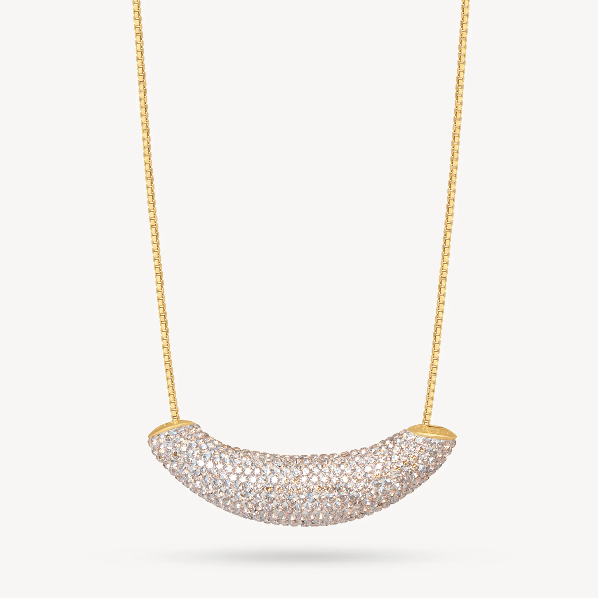 The Champagne Curved Sparkle Necklace is a bold new silhouette that brings fluid movement and maximum shine to your neckline. Featuring a puffed, arched bar fully set in our limited-edition Champagne Sparkle crystals, this necklace makes a radiant statement while offering modern versatility. Suspended on a 14k gold vermeil box chain with a silicone slider, it adjusts with ease for perfect placement every time. Designed to stand alone—but powerful enough to lead your next layered look.
