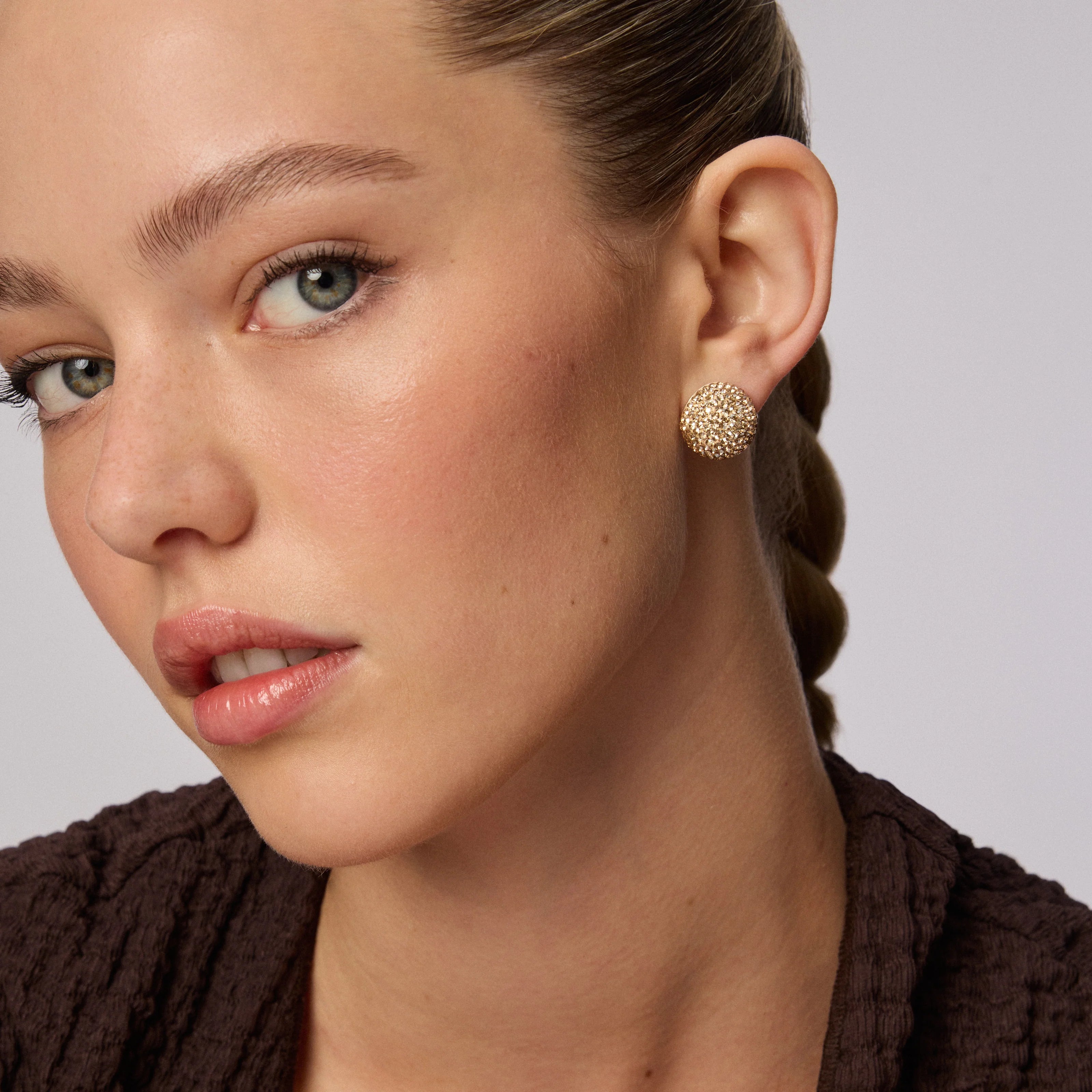 Meet your new go-to statement studs. The Icon Sparkle Stud Earrings feature a sleek, sculptural half-dome design that sits just below the earlobe, catching light from every angle. At 16mm, they offer a bold silhouette softened by fluid curves and signature Sparkle. Available in White, Soft Gold, and Rose Gold, these studs are designed to feel festive for the holidays and effortless every day after. Consider them your new everyday icons.