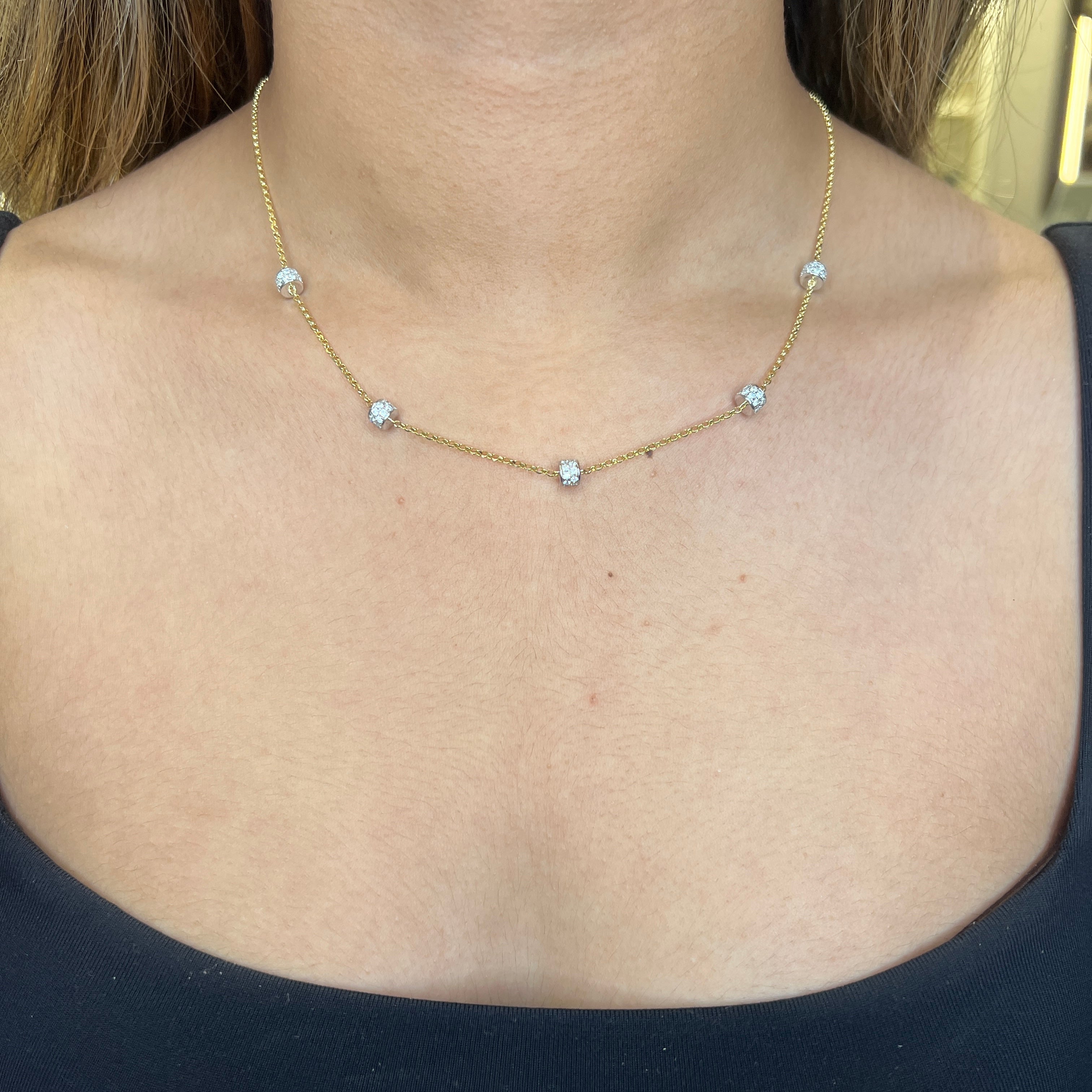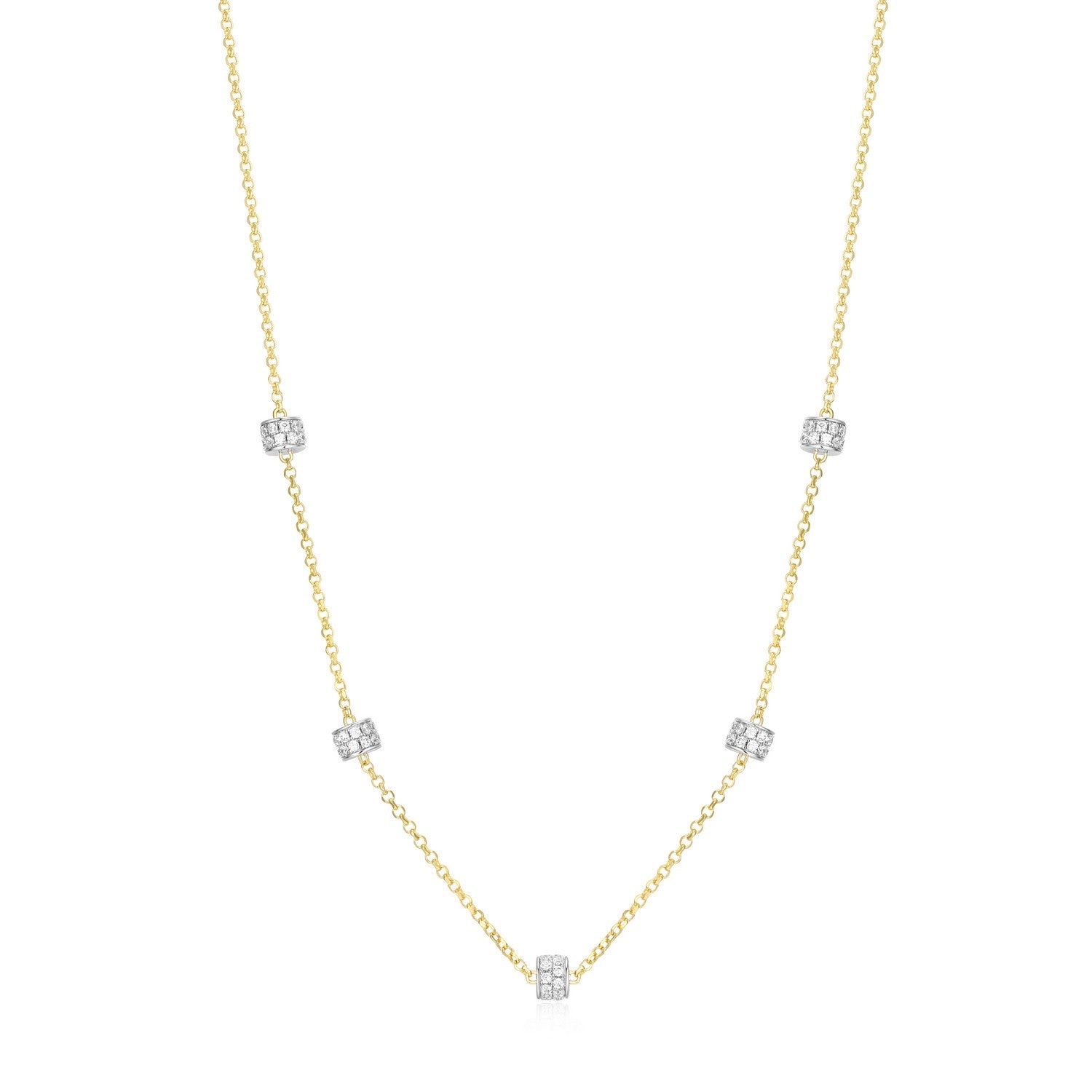 Delicate and radiant, this sterling silver rondelle station necklace combines timeless style with modern versatility. Crafted in sterling silver and enhanced with gold and rhodium plating, it features sparkling cubic zirconia–adorned rondelle stations spaced evenly along the chain for a touch of refined brilliance. Perfect for layering or wearing solo, this necklace adds effortless elegance to any look.