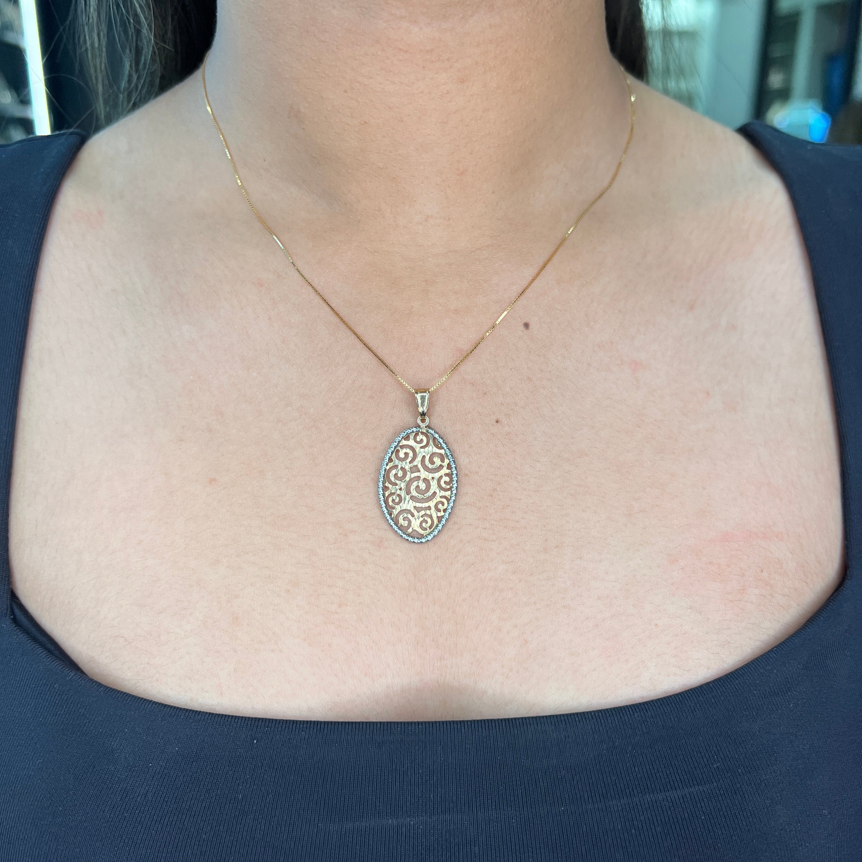 10K Yellow and White Gold Diamond Cut Oval Filigree Necklace
