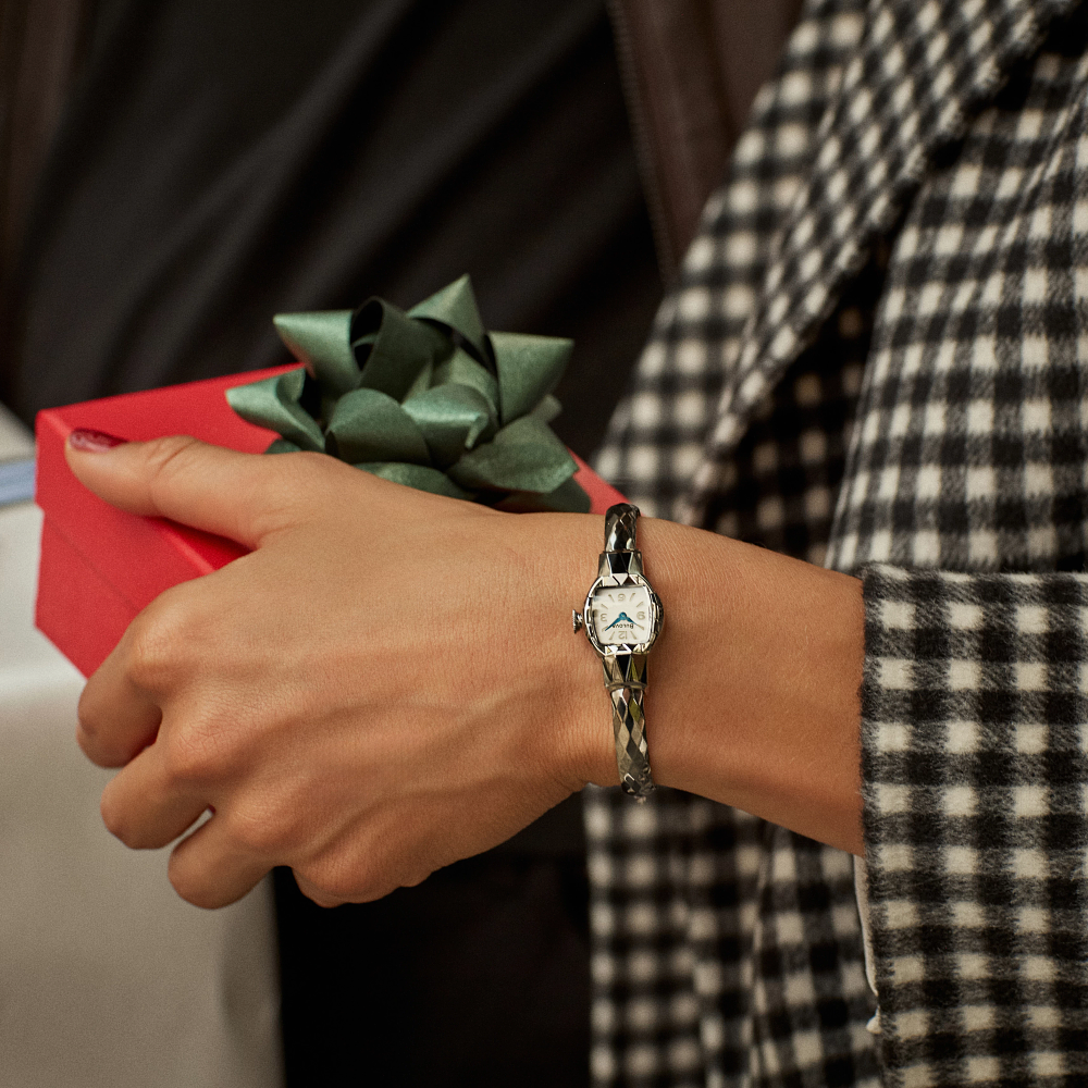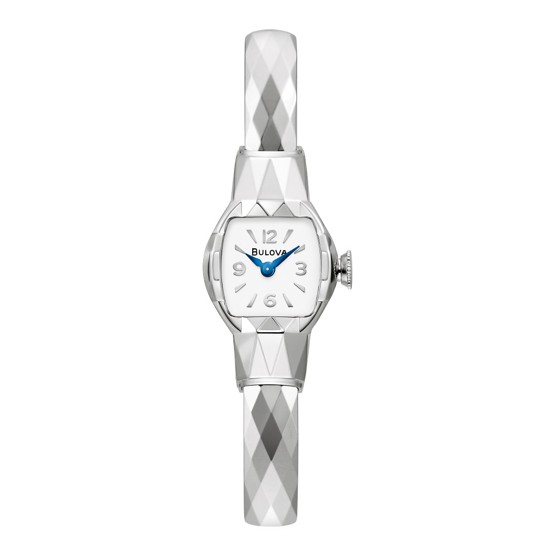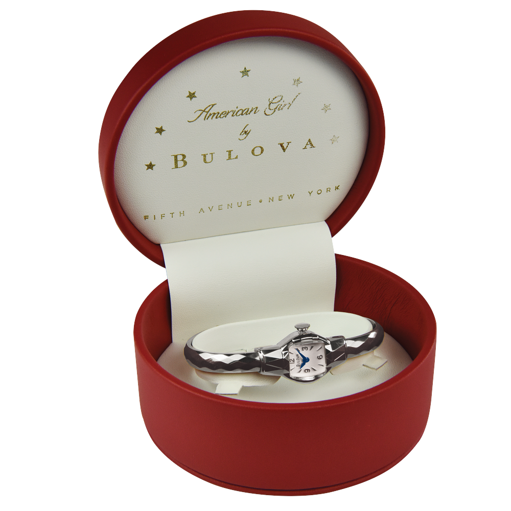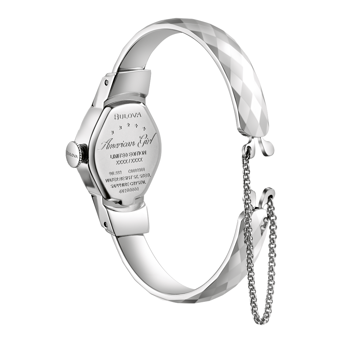 Striking a delicate balance of femininity and powerful charm, our new American Girl “M” timepiece is inspired by the original ladies’ design from 1957 that was coined “a superb Bulova watch and a magnificent bracelet in one glamorous ensemble,” and has become an instant style sensation. Reimagined from the Bulova Archives with a new elegance, the limited-edition American Girl timepiece features a faceted silver-tone stainless steel design with a petite tonneau-shaped case finished with a double-domed sapphire crystal and a white dial with blue minute and hour hands. The faceted bangle features jewellery tongue-in-groove clasps complete with a 65mm chain extender to ensure a secure fit for small to larger wrists. Channel timeless chic with this must-have accessory. Limited to 3,000 numbered pieces worldwide and presented in an elegant red keepsake box with white satin lining.