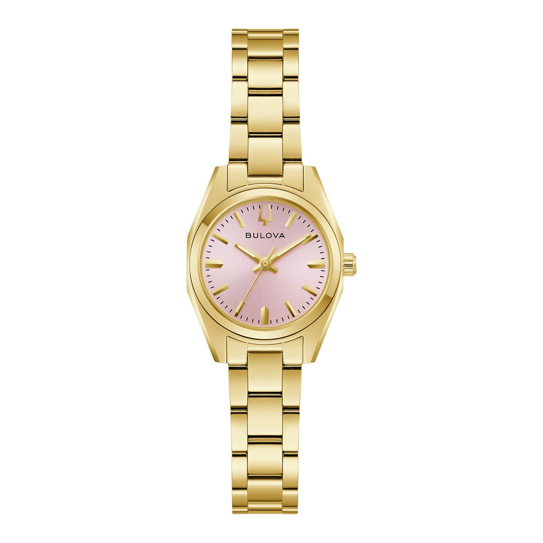 Defined by exceptional quality and sophisticated aesthetics, the Bulova ladies’ Surveyor is the quintessential modern timepiece updated with a mini 23mm case. Sculpted edges and faceting distinguish the gold-tone stainless steel case, with polished and brushed finishing, a flat sapphire crystal, and a matching 3-link gold-tone stainless steel bracelet with a push-button deployant clasp and easy-release latched spring bars. The radiant pink dial has a sunburst finish and gold-tone accents and hands with luminescent fill. For those with a discerning eye for refined luxury, this Bulova women’s timepiece is the perfect everyday companion.