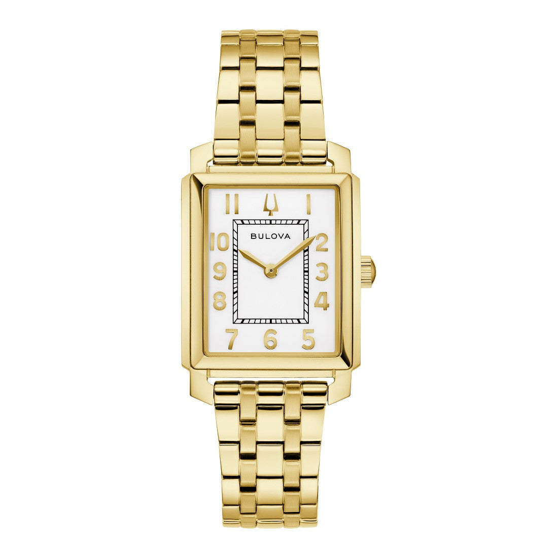 Embrace a refined elegance with this impressive Bulova women’s timepiece from the Sutton collection. Distinguished by a gold-tone stainless steel rectangular case, the watch features a mineral crystal and a finishing that dazzles in the light. The brilliant white enamel dial is accented with applied gold-tone numerals and hands for a look of true sophistication. A matching five-link gold-tone stainless steel bracelet features a deployant closure with pushers for a perfect fit and latched spring bars for easy release. Experience an elevated sense of luxury with this Bulova ladies’ timepiece for the woman with an exceptional sense of style.
