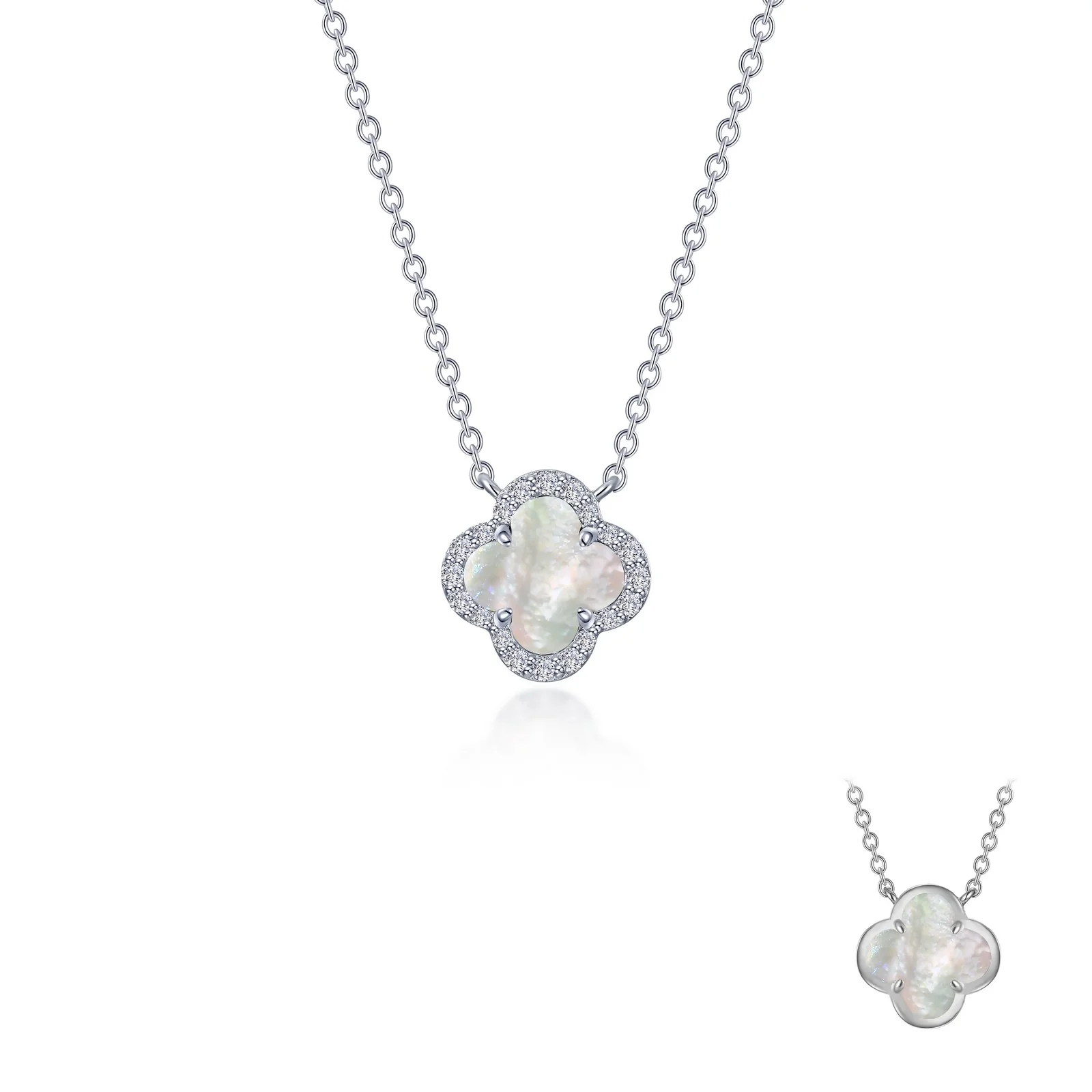 Timeless elegance. This charming adjustable halo necklace features a cultured freshwater mother-of-pearl good-luck symbol surrounded by Lafonn Lassaire simulated diamonds. In sterling silver bonded with platinum or using Lafonn's exclusive TR Gold, a new and improved plating process that preserves the rich color of gold and enhances the wearability of our gold-plated styles.