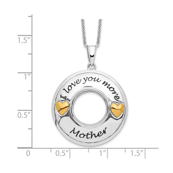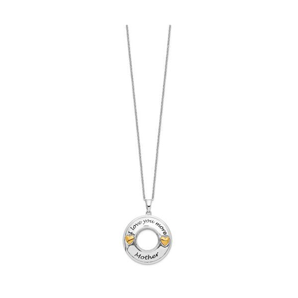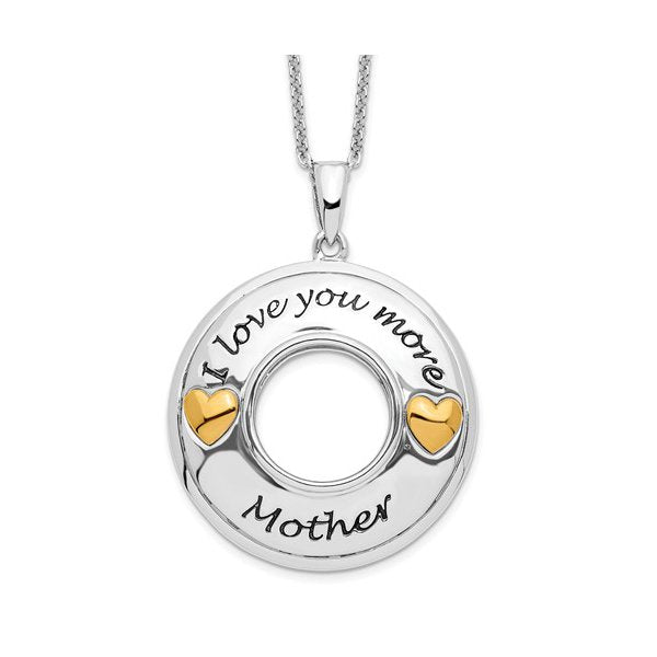 A heartfelt Sterling Silver necklace featuring rhodium and gold plating, designed with an “I Love You More, Mother” motif and accented with sparkling Cubic Zirconia—an elegant keepsake that celebrates a mother’s love.