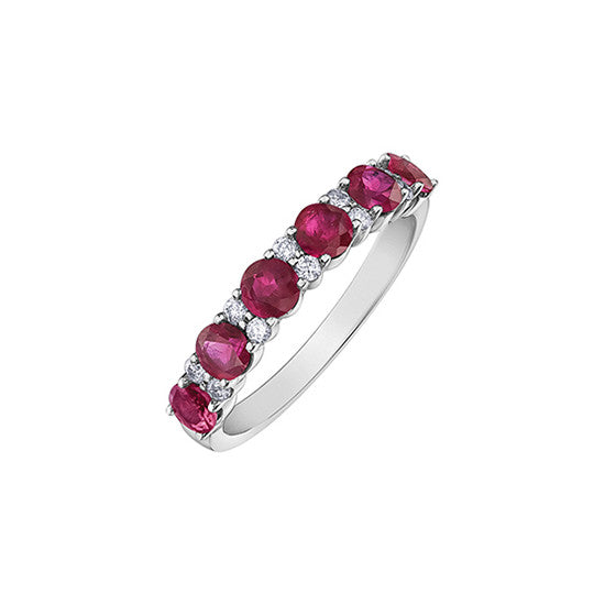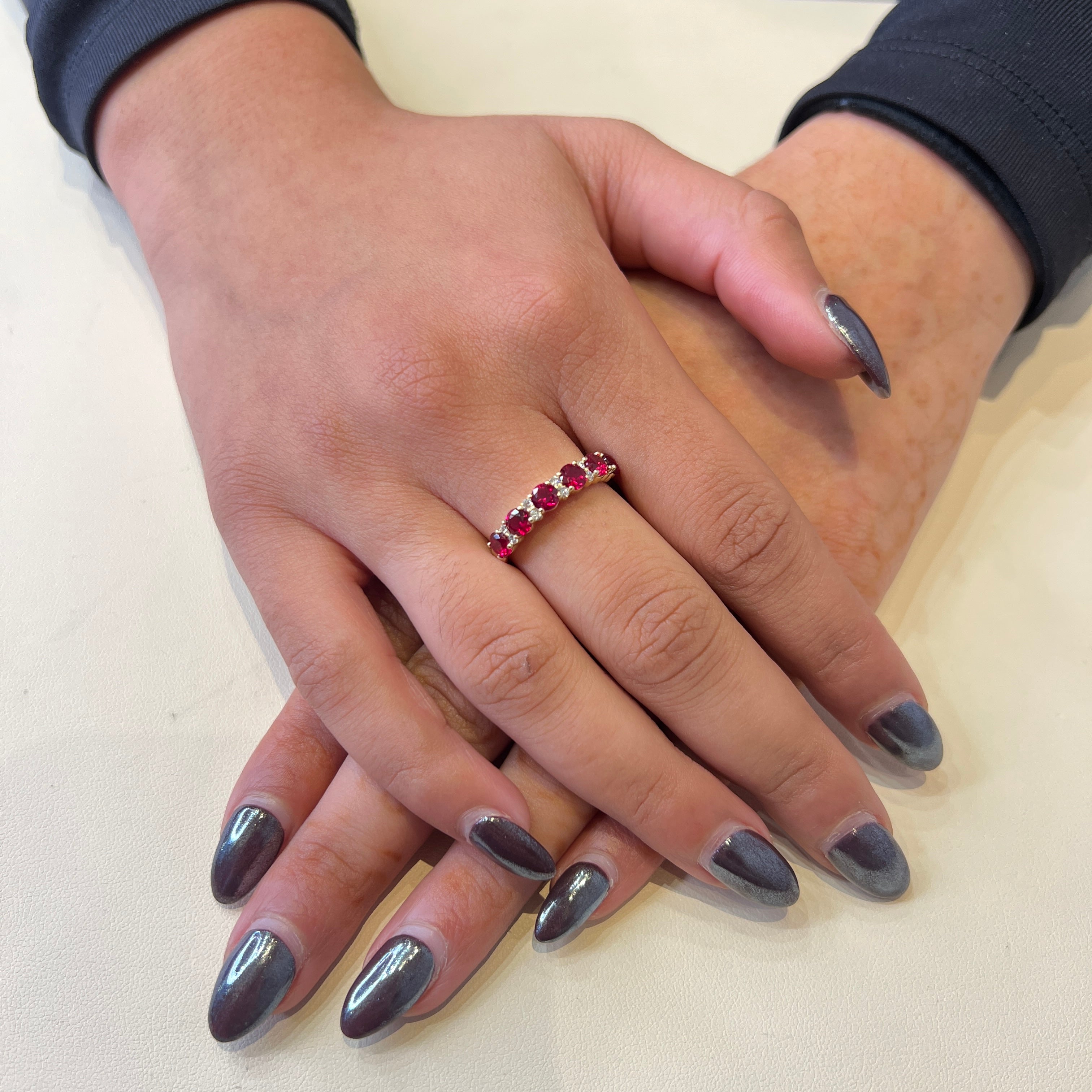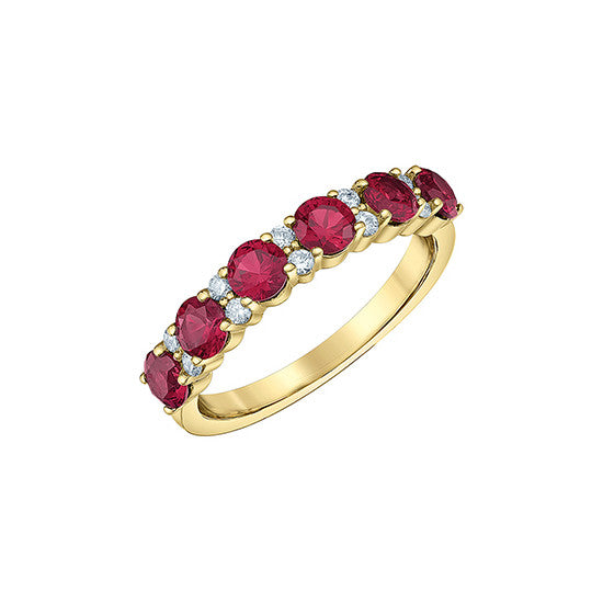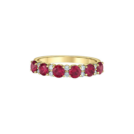 Radiating warmth and passion, this 10K gold lab-grown ruby and diamond band is a captivating expression of timeless elegance. The design features a graceful row of lab-grown rubies, their rich crimson hue symbolizing love, vitality, and strength, perfectly complemented by the brilliant sparkle of lab-grown diamonds.
