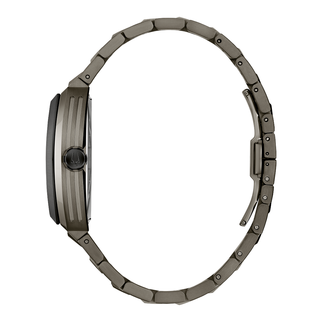 This Bulova men’s watch from the Maquina collection offers daringly avant-garde design. The watch features a 40mm gun metal- and black-tone stainless steel case with a curved sapphire crystal and a gun metal-tone stainless steel bracelet with a push-button deployant closure. The green patterned dial with black dial ring and bridges has black hands and silver-tone markers with luminescent fill, with a central aperture revealing the inner workings of the 21-jewel automatic, also visible through a transparent case back, skeletonized movement which has a 42-hour power reserve. With its mechanical heart and unrivaled modern form, this Bulova men’s timepiece offers a uniquely individual expression of style.