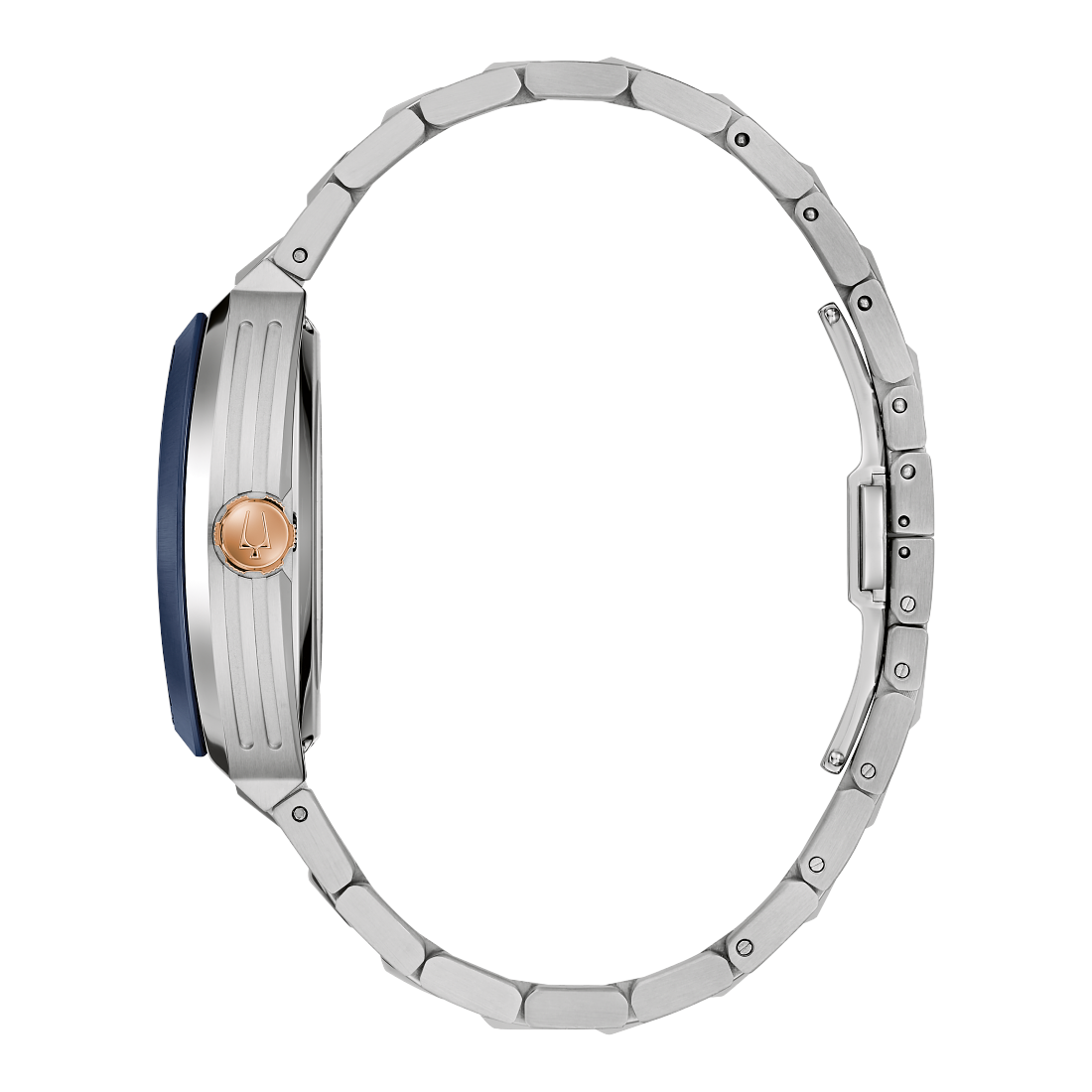 This Bulova men’s watch from the Maquina collection offers daringly avant-garde design. The watch features a 40mm rose gold- and silver-tone stainless steel case with a curved sapphire crystal, a blue bezel, and a silver-tone stainless steel bracelet with a push-button deployant closure. The blue patterned dial with black dial ring and bridges has rose-gold tone hands and markers with luminescent fill and a central aperture revealing the inner workings of the 21-jewel automatic, also visible through a transparent case back, skeletonized movement which has a 42-hour power reserve. With its mechanical heart and unrivaled modern form, this Bulova men’s timepiece offers a uniquely individual expression of style.