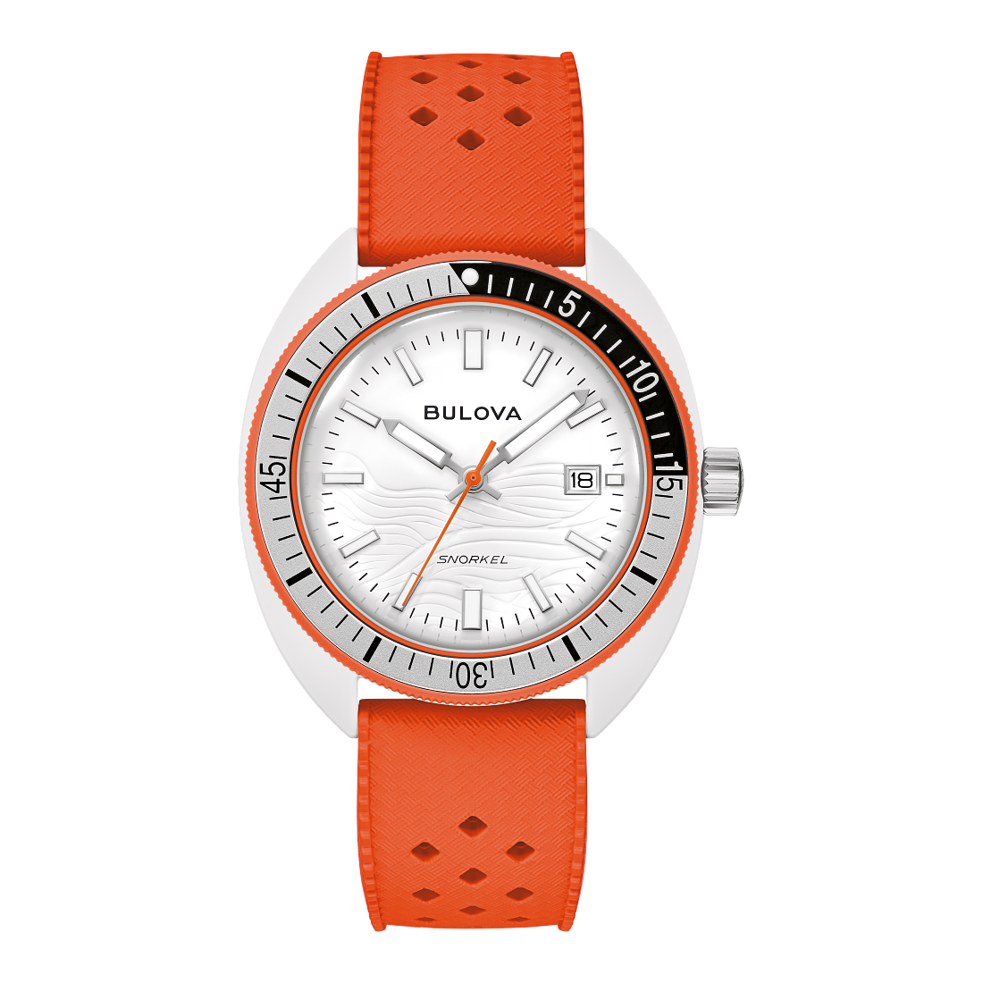 Continuing Bulova’s tradition of innovation and fine craftsmanship, our new Snorkel collection blends vintage-inspired design with a fresh, modern twist. The reimagined Bulova Snorkel shares DNA with the iconic Oceanographer through its classic yet recognizable case shape. In vibrant hues inspired by marine life, each 41mm timepiece features a retro case shape made with a new innovative Hybrid Ceramic—a composite material that feels luxuriously smooth with enhanced durability. This model’s wave-pattern dial and striking hybrid case pair perfectly with an orange unidirectional bezel with a bi-colour insert and a case back etched with an image of a Clownfish, paying homage to its oceanic roots. With silver-tone hands and markers with luminescent fill, a date display, and a matching orange perforated rubber strap, the men’s Snorkel embodies timeless design, and with 100m water resistance, it perfectly balances style and functionality with Bulova’s legacy of iconic watchmaking.