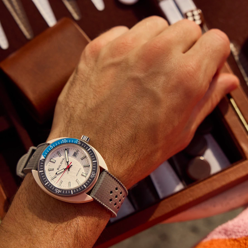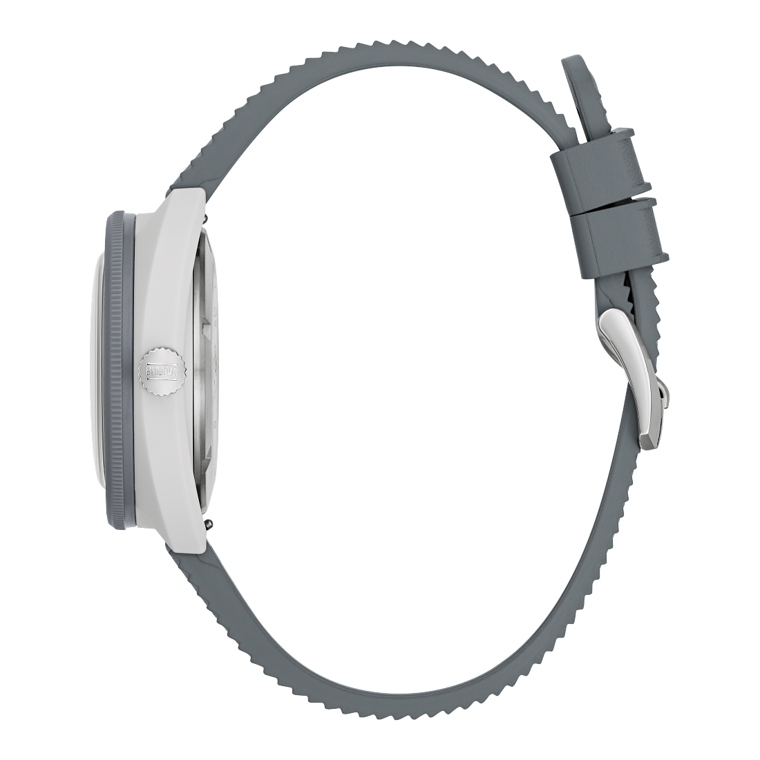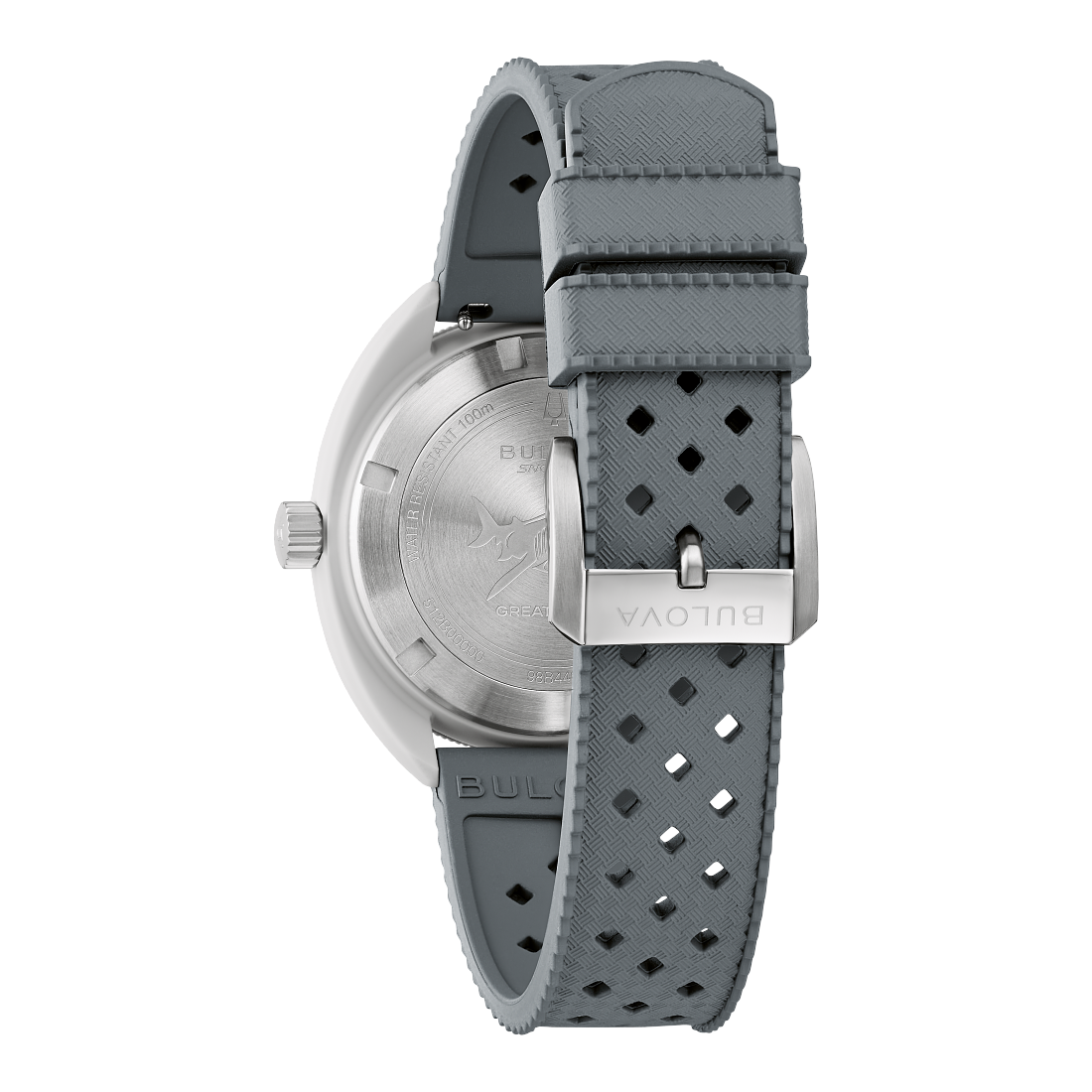 Continuing Bulova’s tradition of innovation and fine craftsmanship, our new Snorkel collection blends vintage-inspired design with a fresh, modern twist. The reimagined Bulova Snorkel shares DNA with the iconic Oceanographer through its classic yet recognizable case shape. In hues inspired by marine life, each 41mm timepiece features a retro case shape made with a new innovative Hybrid Ceramic—a composite material that feels luxuriously smooth with enhanced durability. This model’s wave-pattern white dial and striking hybrid case pair perfectly with a gray unidirectional bezel with a bi-colour insert and a case back etched with an image of a Great White Shark, paying homage to its oceanic roots. With silver-tone hands and markers with luminescent fill, a date display, and a matching gray perforated rubber strap, the men’s Snorkel embodies timeless design, and with 100m water resistance, it perfectly balances style and functionality with Bulova’s legacy of iconic watchmaking.