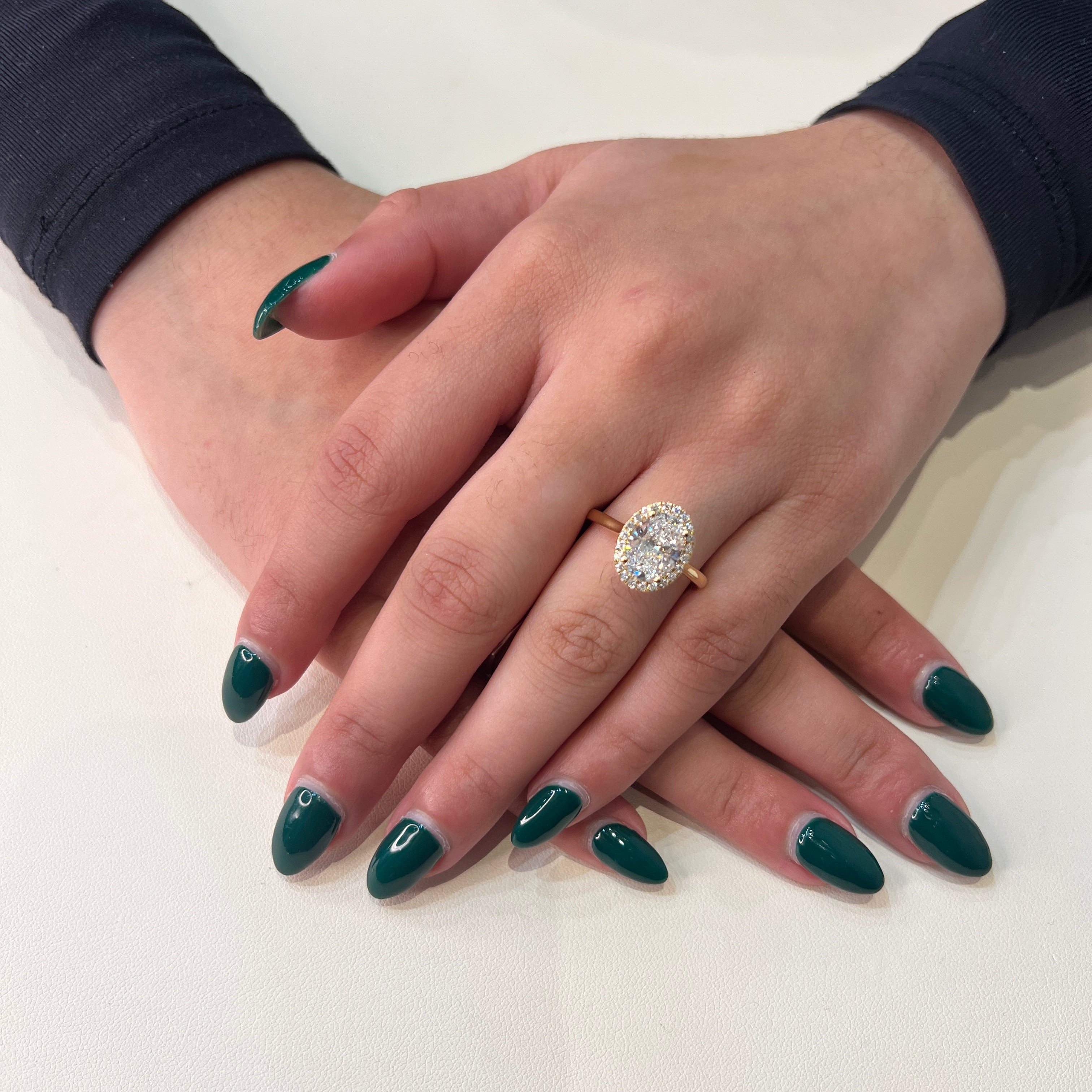 brilliant oval-cut lab grown diamond with natural diamonds —weighing a total of 2.15 carats, radiates unmatched fire and brilliance. The center stone is embraced by a glittering halo of accent diamonds, amplifying its sparkle and creating a breathtaking aura of light. The refined 14K gold setting—available in yellow, white, or rose gold—adds warmth and balance, harmonizing beautifully with the ring’s graceful silhouette. A masterpiece of ethical luxury and romantic artistry, this engagement ring is designed for those who seek a symbol of love as enduring and radiant as the moon itself.