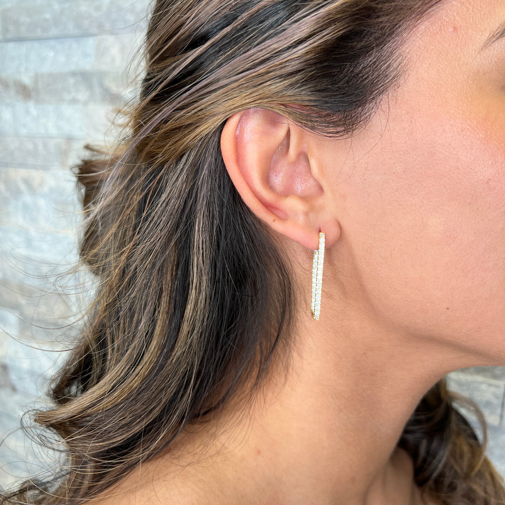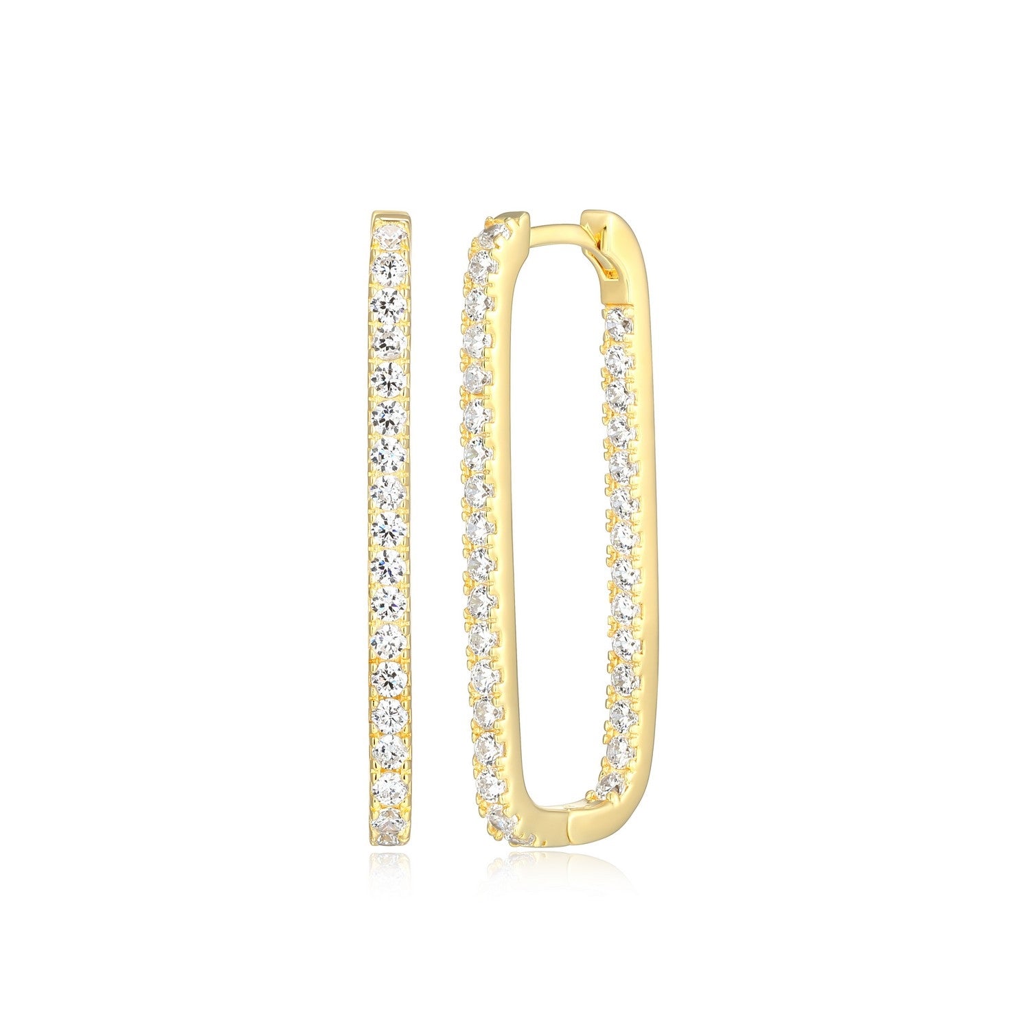 A modern take on the classic hoop, these earrings feature elongated links accented with sparkling cubic zirconia for a touch of shimmer. Crafted in sterling silver with a rich 18K gold plating, they combine sleek design with timeless shine. Lightweight and versatile, they’re perfect for elevating everyday looks or adding polish to evening wear.