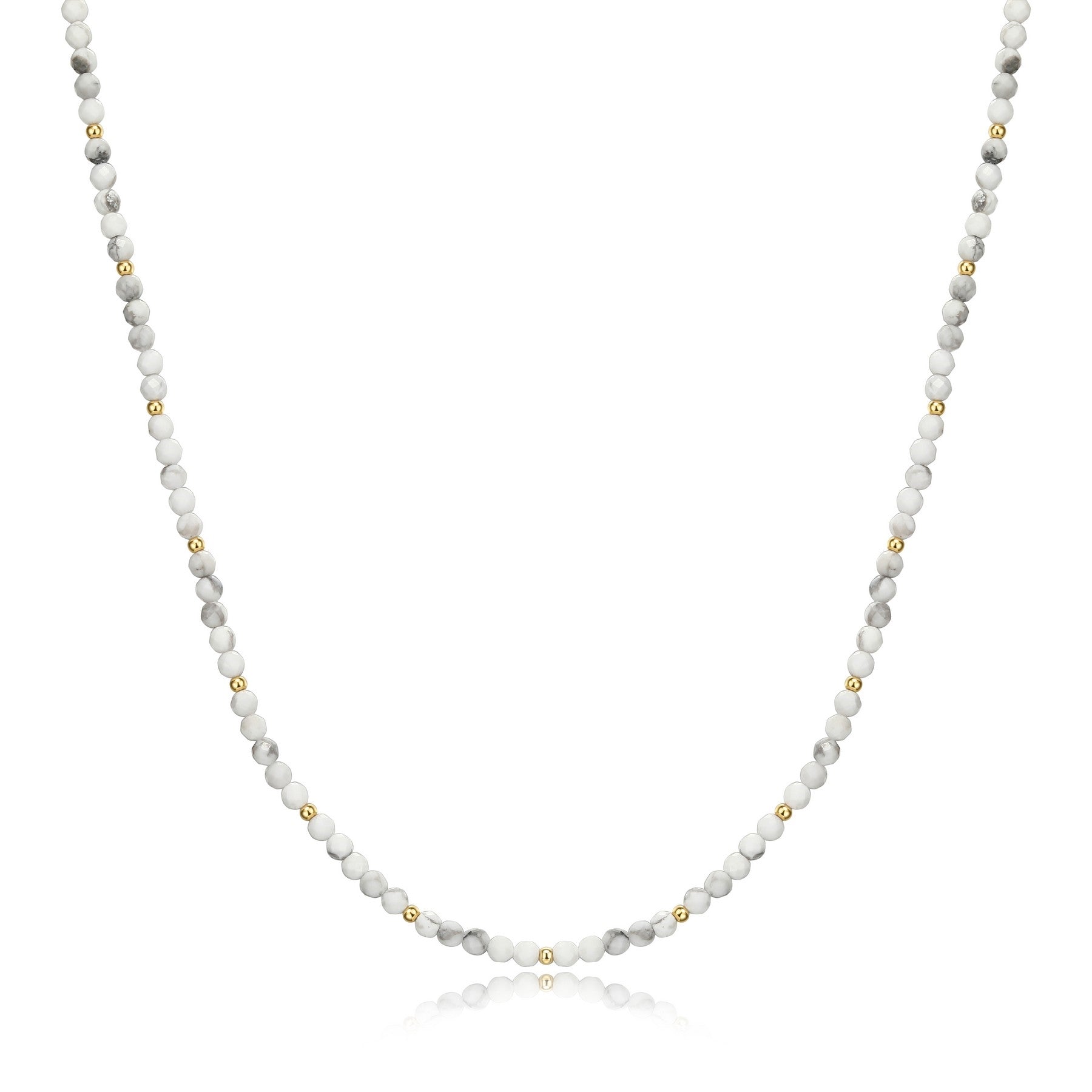 This necklace polished white howlite beads, each with soft grey veining that makes every piece unique. Known for its natural, calming appearance, howlite brings a quiet elegance to the design. Finished with 18K gold plated sterling silver for a warm, modern touch. Simple, elegant, and easy to wear every day.