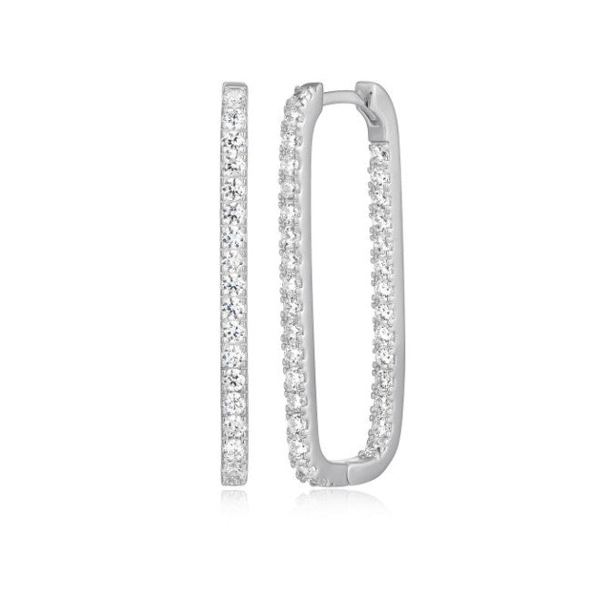 A modern take on the classic hoop, these earrings feature elongated links accented with sparkling cubic zirconia for a touch of shimmer. Crafted in sterling silver rhodium plating, they combine sleek design with timeless shine. Lightweight and versatile, they’re perfect for elevating everyday looks or adding polish to evening wear.
