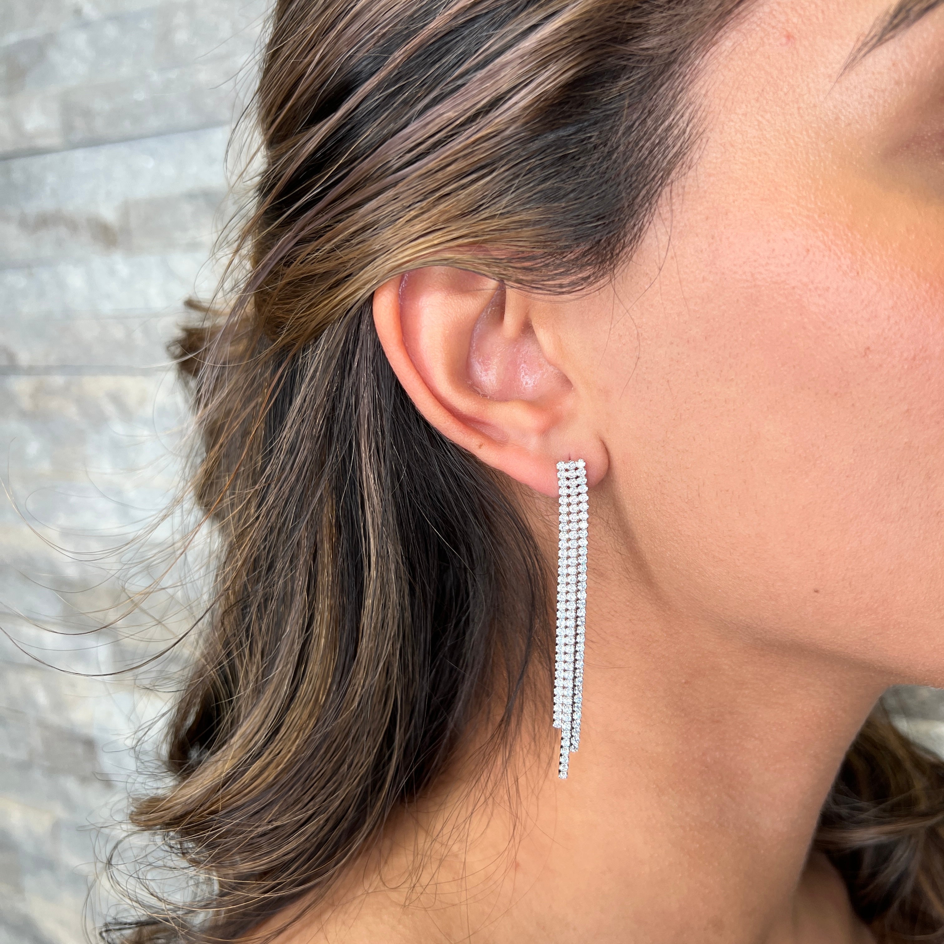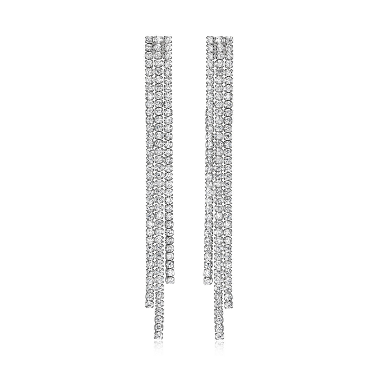 These statement drop earrings feature three slender strands of sparkling cubic zirconia that cascade gracefully for a sleek, elongated look. Crafted in polished sterling silver, the triple-strand design catches light from every angle, adding effortless movement and shine. Perfect for evenings out or whenever you want to elevate your style with a touch of glamour.