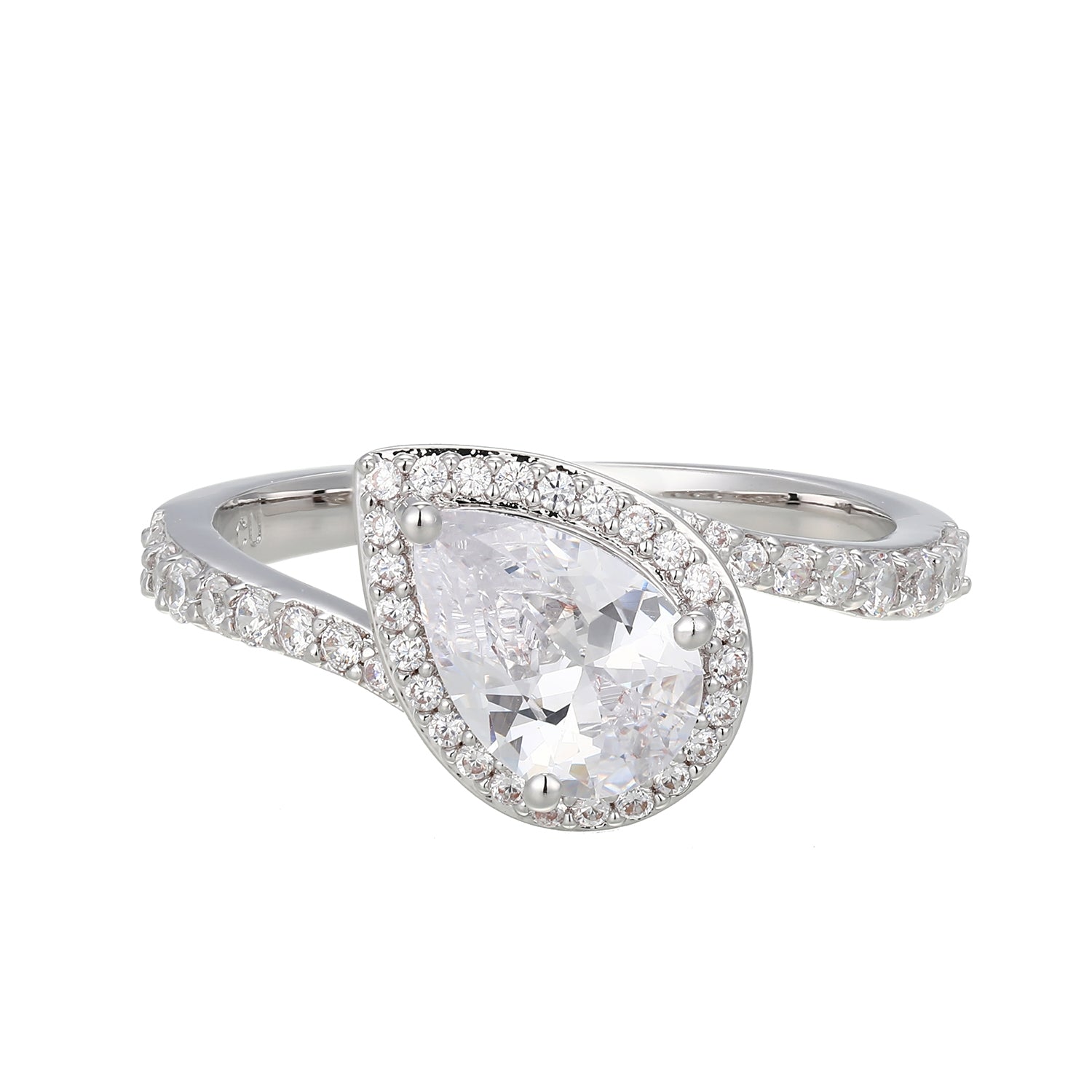 A graceful twist on the classic halo, this bypass ring features a pear‑cut cubic zirconia center framed by a glittering halo of pavé stones. The band elegantly curves around the main setting, crafted in rhodium‑plated sterling silver for lasting shine and resistance to tarnish. With its intertwining silhouette, it offers a modern yet timeless statement on any hand.