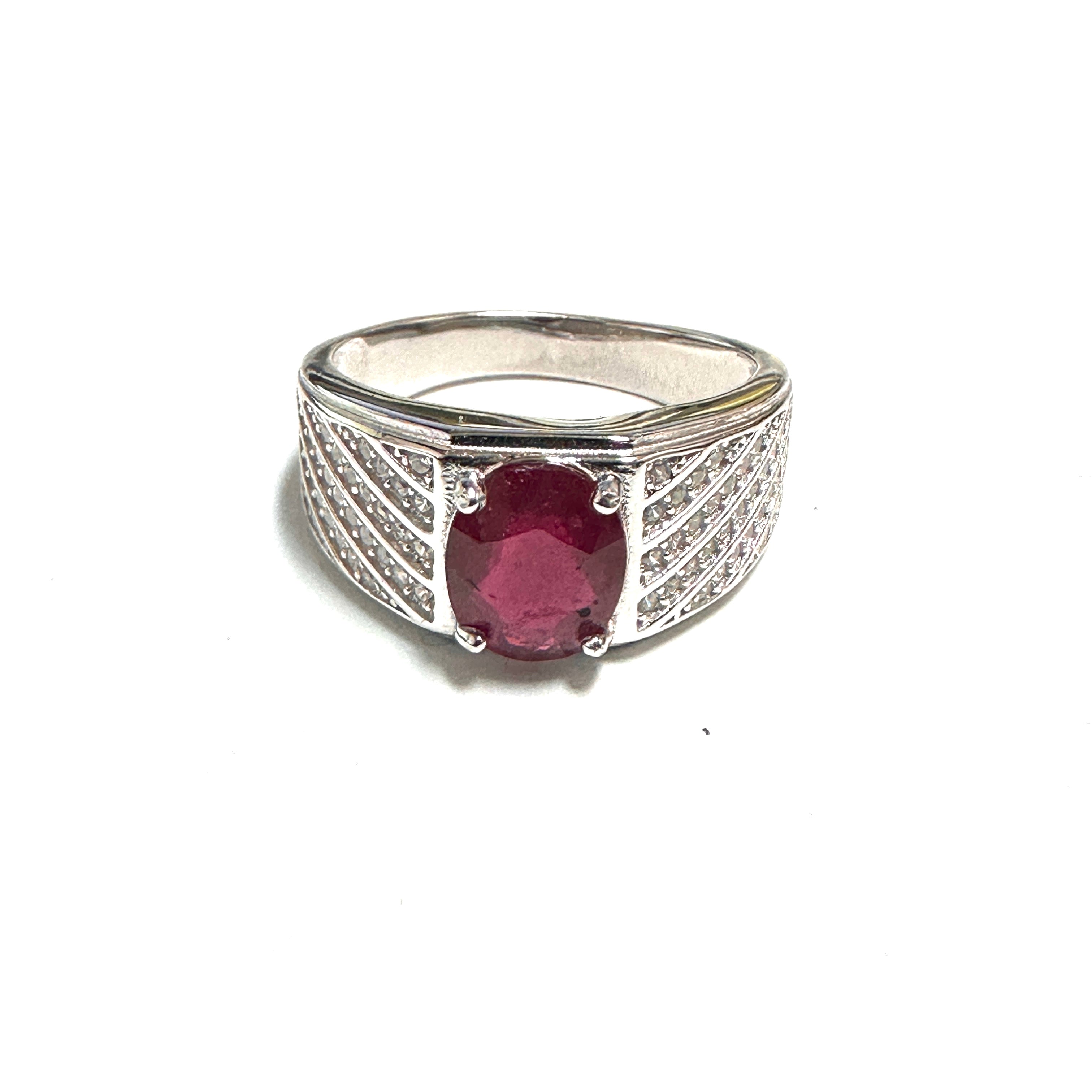 Sterling Silver Rhodium Plated Lab Grown Ruby and CZ Ring