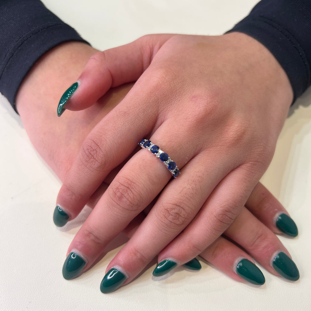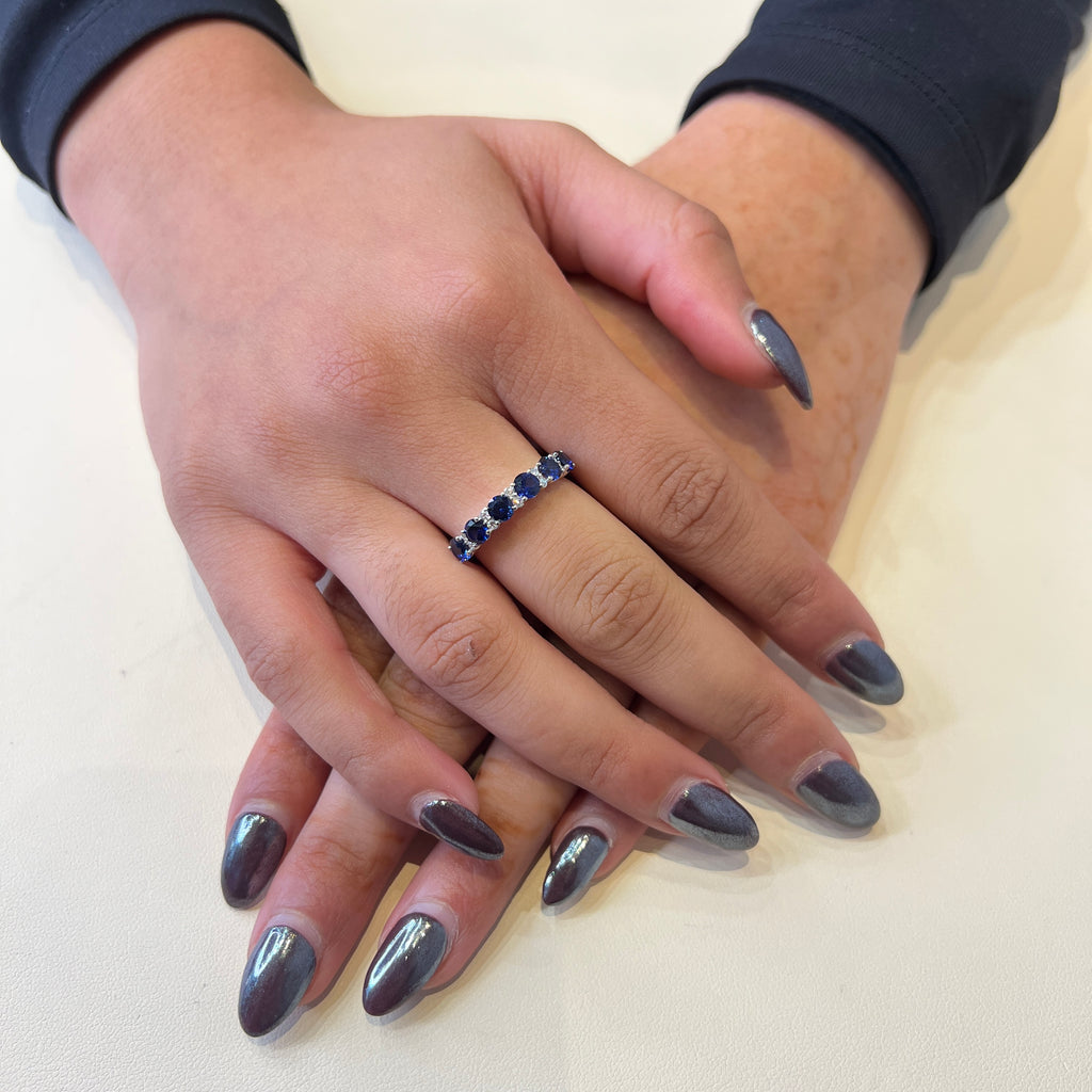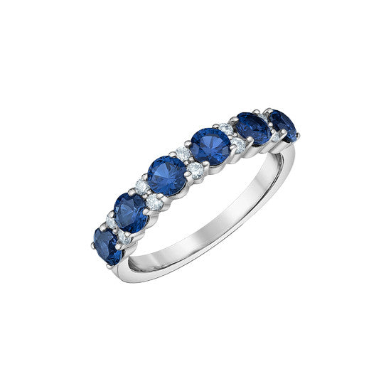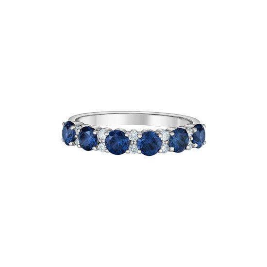 Elegant and enduring, this 10K gold lab-grown sapphire and diamond band captures the perfect harmony of color and brilliance. Deep blue lab-grown sapphires, symbols of loyalty, wisdom, and sincerity, alternate beautifully with sparkling diamonds, creating a timeless band that radiates sophistication.