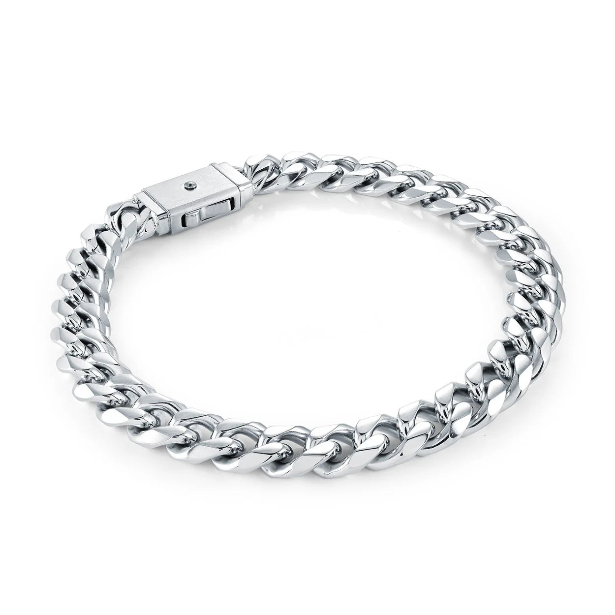 Crafted in durable polished stainless steel or gold-plated, this 8mm curb bracelet delivers both strength and style. The square clasp adds a sleek, modern touch while ensuring a secure fit, making it a versatile piece for everyday wear or layering.