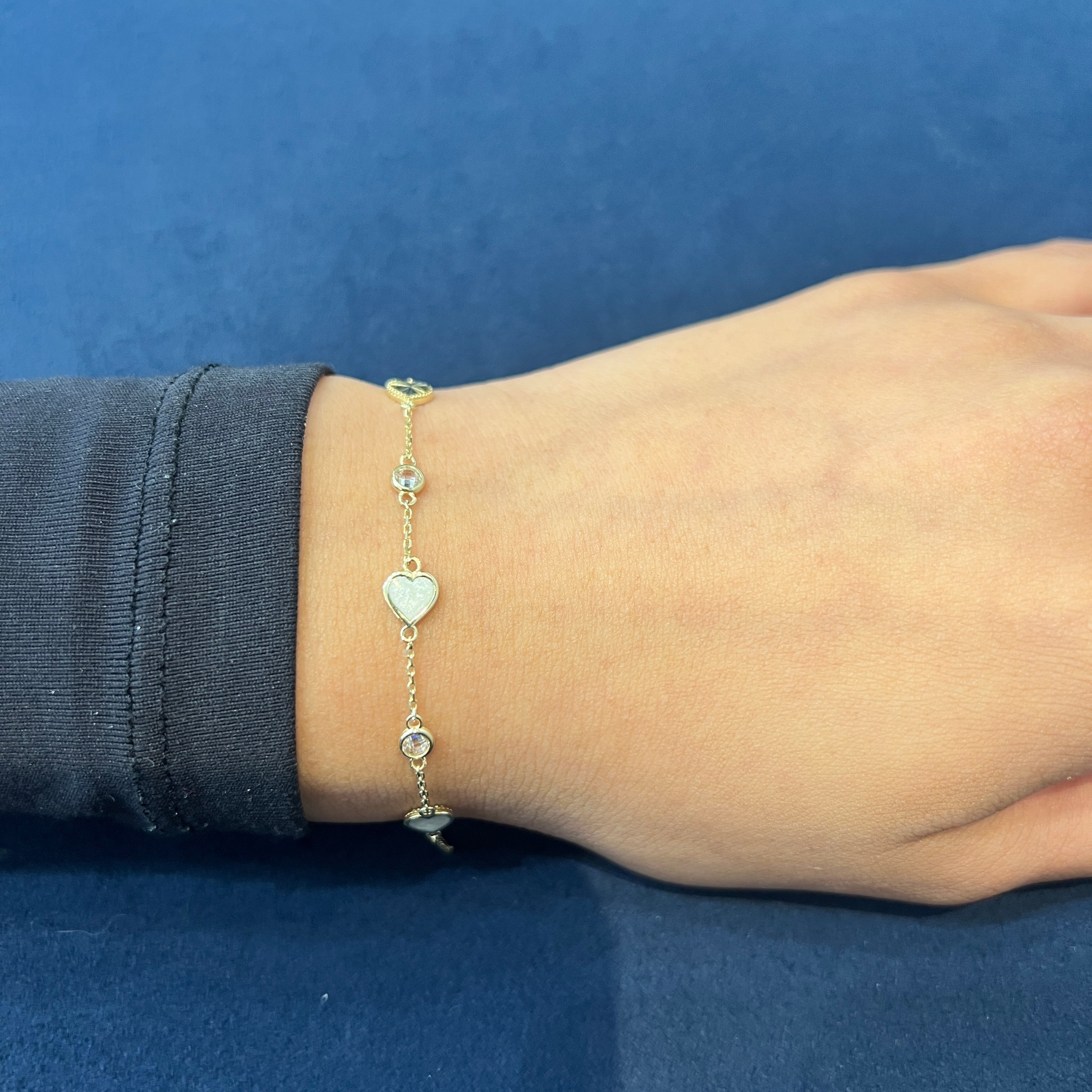 A delicate and feminine bracelet crafted from 10-karat yellow gold, featuring a heart-shaped motif inlaid with lustrous mother-of-pearl and accented with sparkling cubic zirconia stones. The heart design adds a romantic, symbolic touch, while the mother-of-pearl brings soft iridescence and the cubic zirconia offers eye-catching brilliance. The result is a piece that combines timeless elegance and understated glamour — perfect for everyday wear or special occasions.