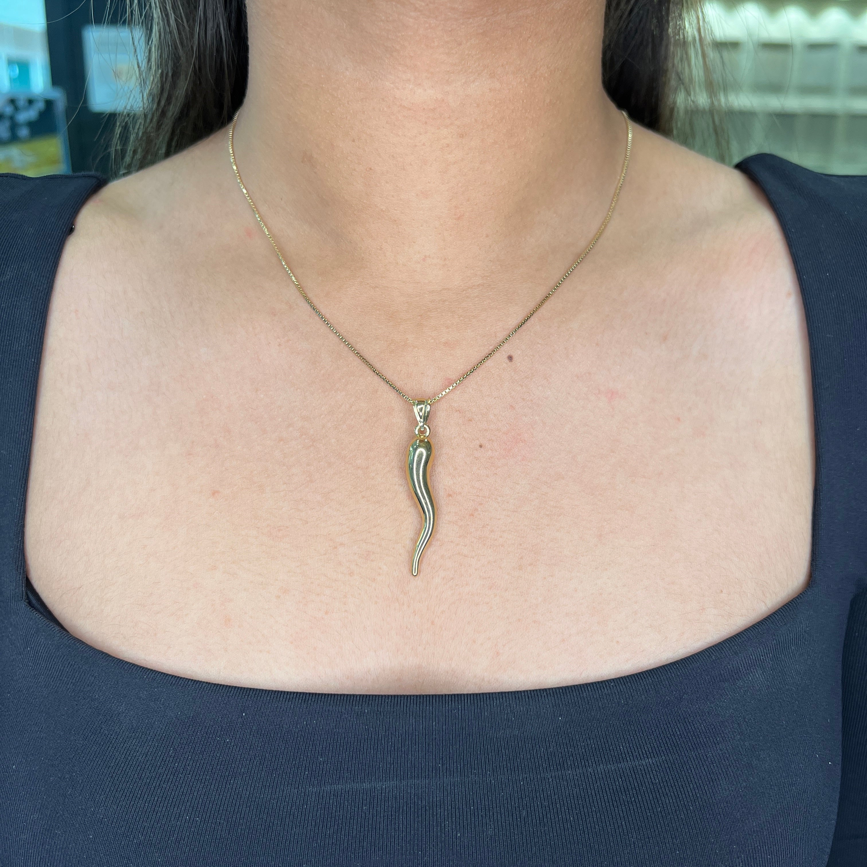 The Italian Horn Pendant is a traditional Italian amulet, often worn as a protective charm. It features a slender, twisted shape resembling a horn or chili pepper. Believed to bring good luck and ward off the evil eye, this pendant is a symbol of Italian folklore and cultural heritage. This pendant can be matched with your preference of gold chain.