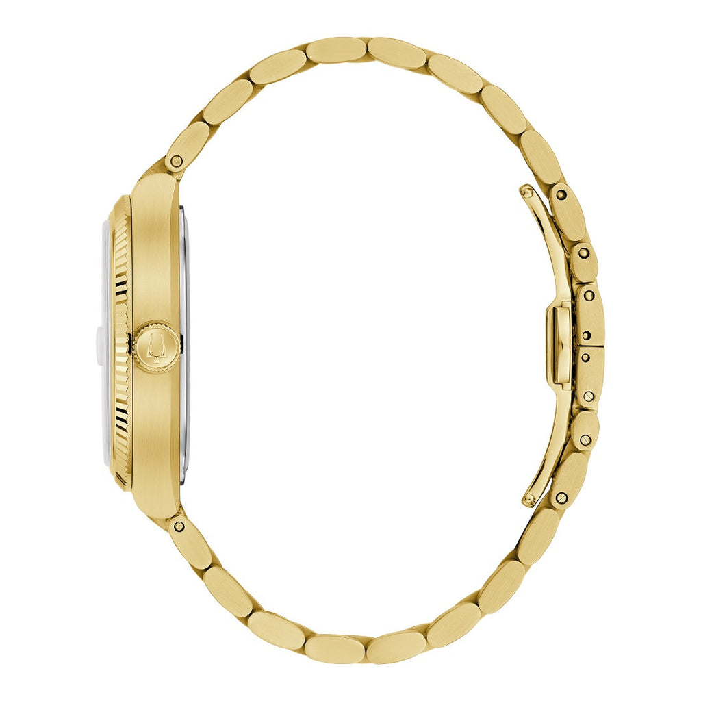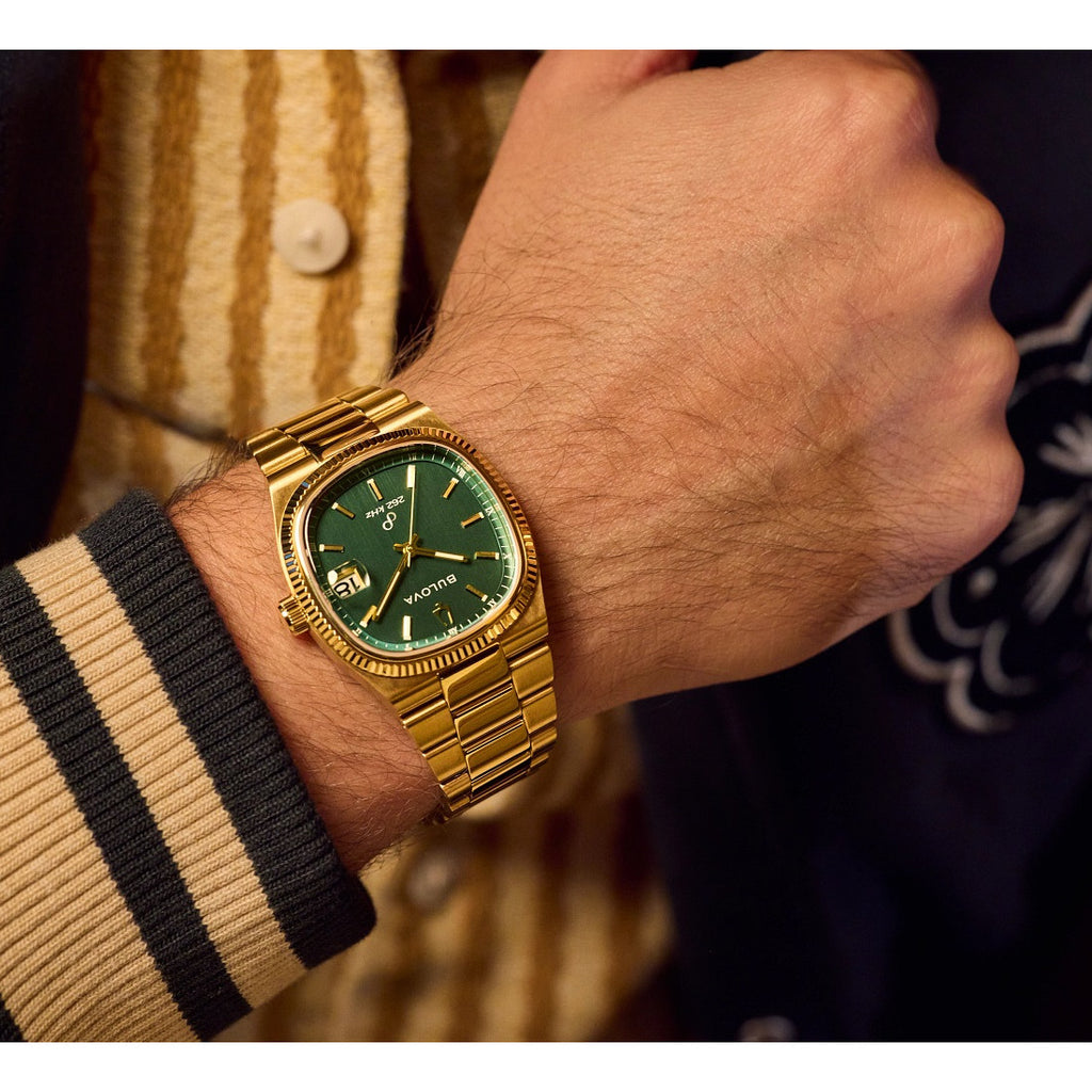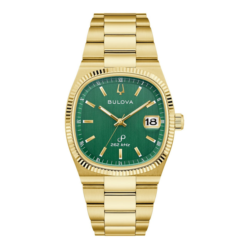 Drawing inspiration from the incredible Bulova Super Seville Day-Date of the 1970s, the men’s Bulova Super Seville merges retro aesthetics with state-of-the-art movement technology for timeless modern appeal. With versatility for every style, the gold-tone stainless steel 38mm case strikes a bold stance with a seamless silhouette created by the TV-shaped case transitioning into the matching integrated 3-link stainless steel bracelet, which features a push-button deployant clasp. An elegant, grooved coin edge bezel enhances the case and surrounds a flat sapphire crystal and its date magnifier. The compelling dial is a verdant vertical brushed green, with polished gold-tone hands and indices and a date situated perfectly at 3 o’clock. The new Bulova Super Seville is powered by our proprietary high-precision quartz Precisionist movement, a revolutionary 8-jewel quartz mechanism vibrating at a remarkable 262kHz, accurate to seconds per year with increased resistance to temperature changes, and with a smooth sweeping second hand. Embrace an effortless kind of elegance with the men’s Bulova Super Seville.