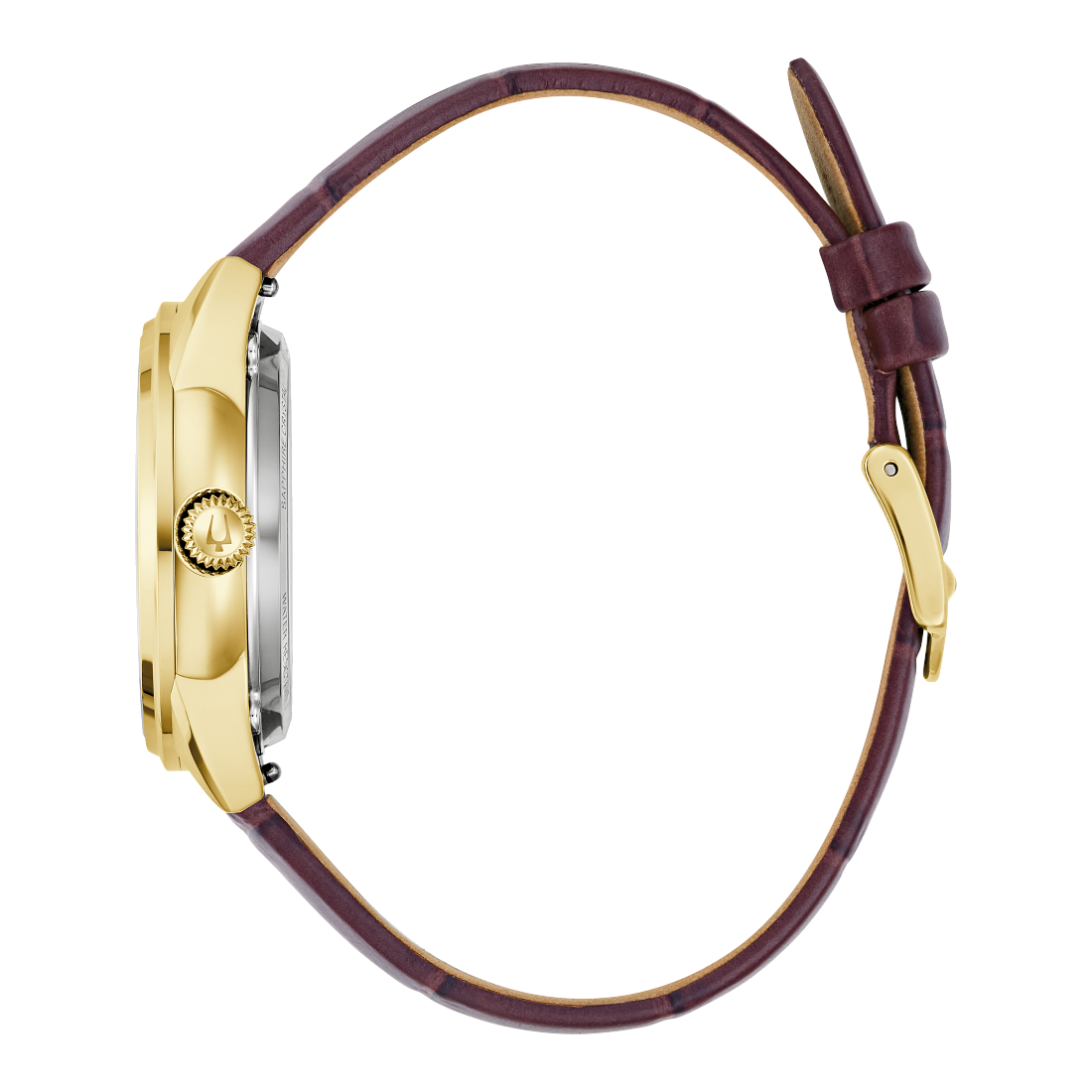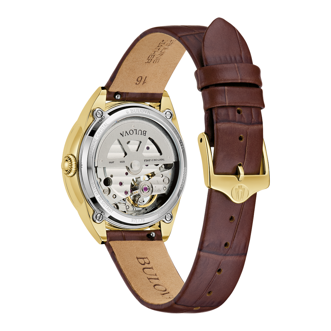 Unparalleled in refinement and timeless in design, this Bulova women’s timepiece introduces a new automatic watch from the Sutton Collection that will elevate your style. The watch features a 34mm gold-tone case with a domed sapphire crystal with anti-reflective coating and is paired with a brown leather strap with a pin-buckle closure. The lustrous mother-of-pearl dial features a sunray pattern, gold-tone hour markers and hands, and a floral aperture revealing the heart of the 21-jewel automatic movement, also visible through a transparent case back, which has a power reserve of 42 hours. This Bulova ladies’ watch is made for those with an eye for style who aren’t afraid to make a statement.