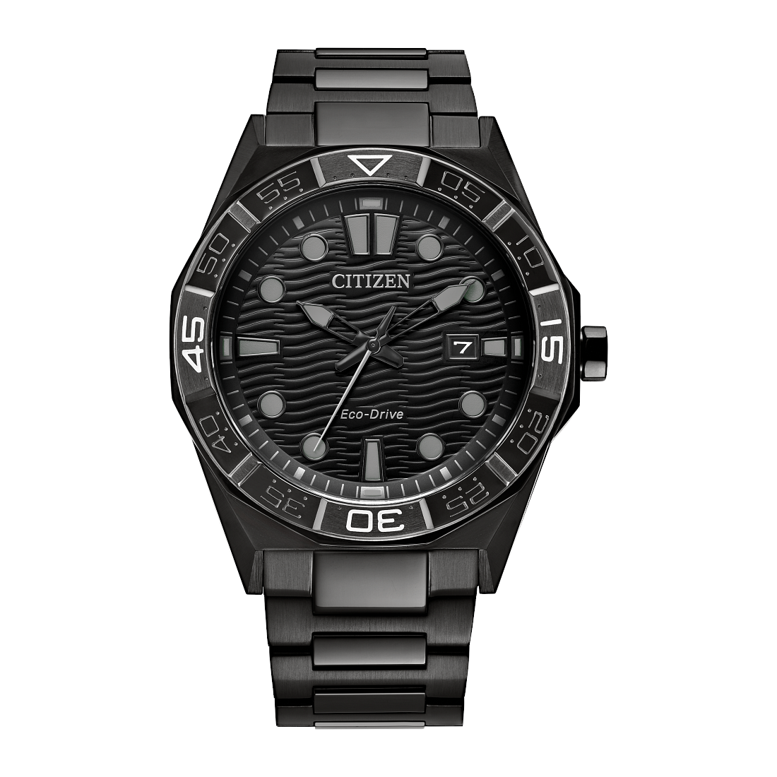 Be bold in monochrome in the latest Sport Casual timepiece. Water resistant up to 100 meters and sturdy in wear at 42mm, the new Brycen is designed in black ion-plated stainless steel. The dark hues of the watch match its sharply angled facets from the case and crown to a bidirectional friction bezel and dial. The display features a straightforward time and date, with the monochromatic charm of the look shining through upon each glance at the wrist. Featuring our Eco-Drive technology – powered by light, any light. Never needs a battery.