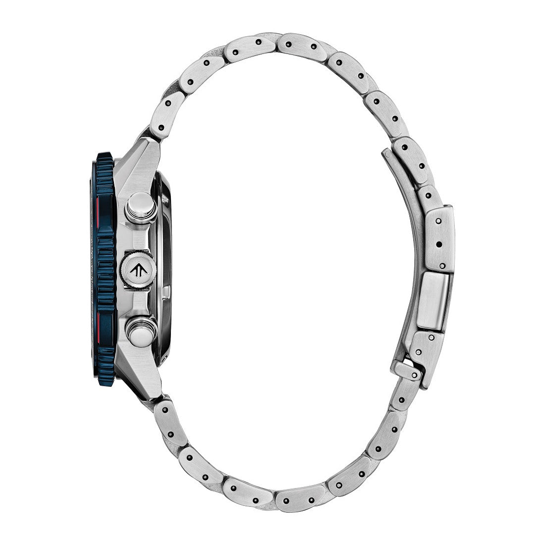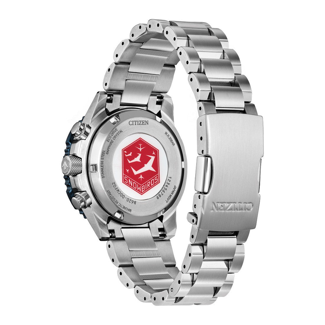 The Snowbirds are the Royal Canadian Air Force's iconic flight demonstration squadron renowned for their precision and thrilling showmanship in each of their flight maneuvers. Using advanced technology and striking looks, these qualities are once again exhibited through the Snowbirds Promaster Air Navihawk. On the wrist, the watch's silver-tone stainless steel case measures 40mm in diameter, wearing boldly with its sharp faceting and satin finishing, while a slide-rule scale on the bidirectional blue and red ion-plated bezel provides additional flight utility. A triple-link stainless steel bracelet secures the timepiece. On the dial, a Snowbirds colourway with black accents adds to the watch's superior legibility, while a sapphire crystal and 200m of water resistance protect it all. Functions include a 1/5 second chronograph measuring up to 60 minutes, 12/24 hour time displays, and a date indicator. The movement is protected via a Snowbirds' insignia-signed case back, and is powered by our proprietary Eco-Drive technology – sustainably powered by light and never needing a battery.
