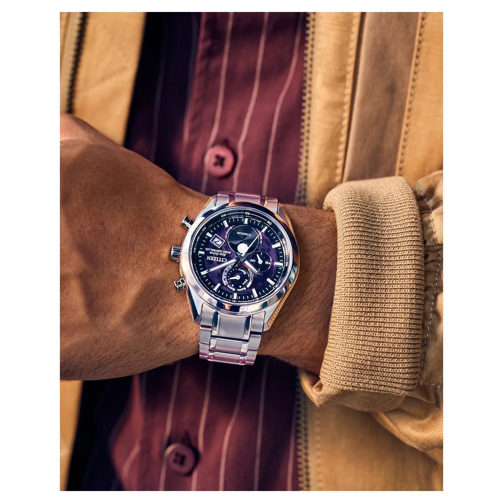 When breakthrough technology and spectacular design meet, the Tsuki-yomi A-T is reading the moon. It’s the world’s first moonphase watch combined with atomic timekeeping innovation from Citizen, and this model is nothing short of impressive. The styling embodies the moon’s surface and a window at 6 o’clock displays the current moon phase. The timepiece measures 43mm in a silver-tone Super Titanium™ case, where sharp faceted edges pair with an elevated design throughout for an eye-catching aesthetic on the wrist. The deep purple dial works in tandem with black accents and silver-tone touches for a display that’s as handsome as it is legible. In addition to its running time, the watch features a moon phase display, world time in 24 time zones, a perpetual calendar, and a day-date functionality. Powered by Citizen’s proprietary Eco-Drive technology to provide light-powered vitality without ever needing a battery. Water resistant up to 100 metres.