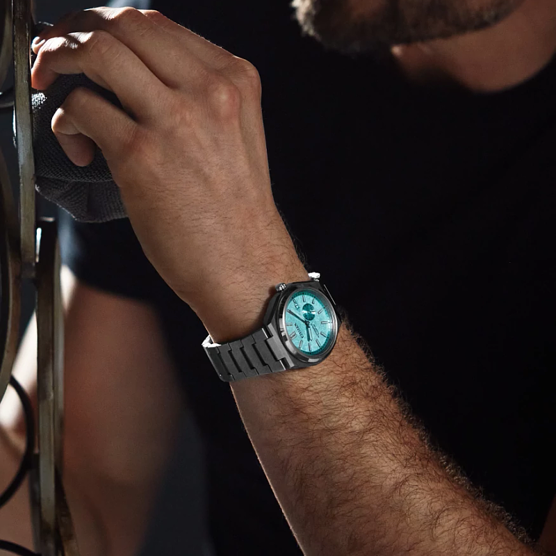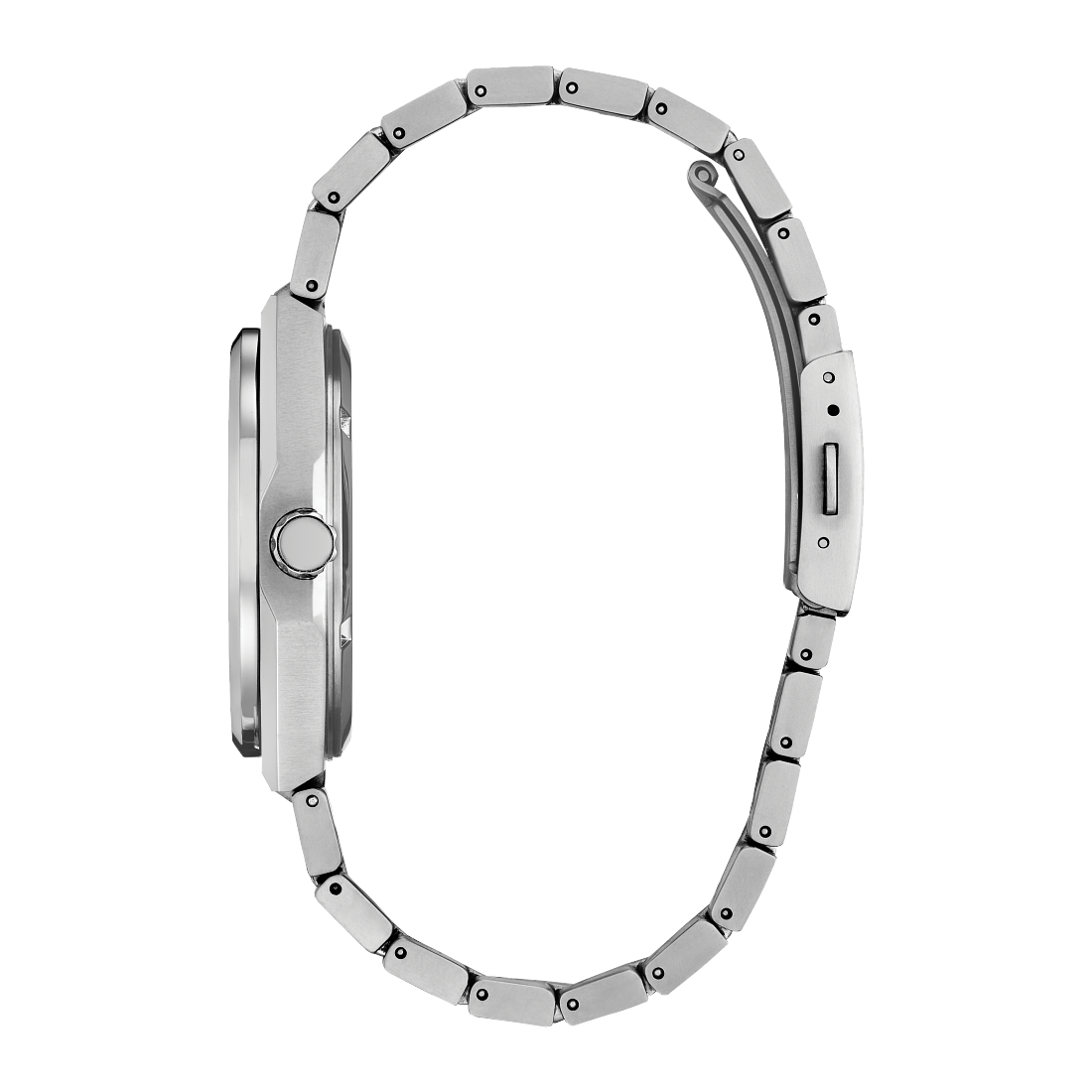 Pairing classic proportions and innovative technology with a distinctly modern style, we present our new Integrated Super Titanium™ Automatic series. Made with our proprietary material, Super Titanium™, which is five times harder and 40% lighter than stainless steel and is scratch- and rust-resistant, this sporty timepiece features a 40.5mm silver-tone Super Titanium™ case that is elevated with finely brushed and polished finishing while being secured to the wrist with an integrated matching bracelet. On the dial, a textured green colour is accented with an outer minute ring in black, with silver-tone details and luminous hands and markers. A date window at the 3 o'clock position adds daily utility, while an off-centre sub-dial beside it indicates the running time powered by the mechanical movement inside. Water resistant to 100 metres.