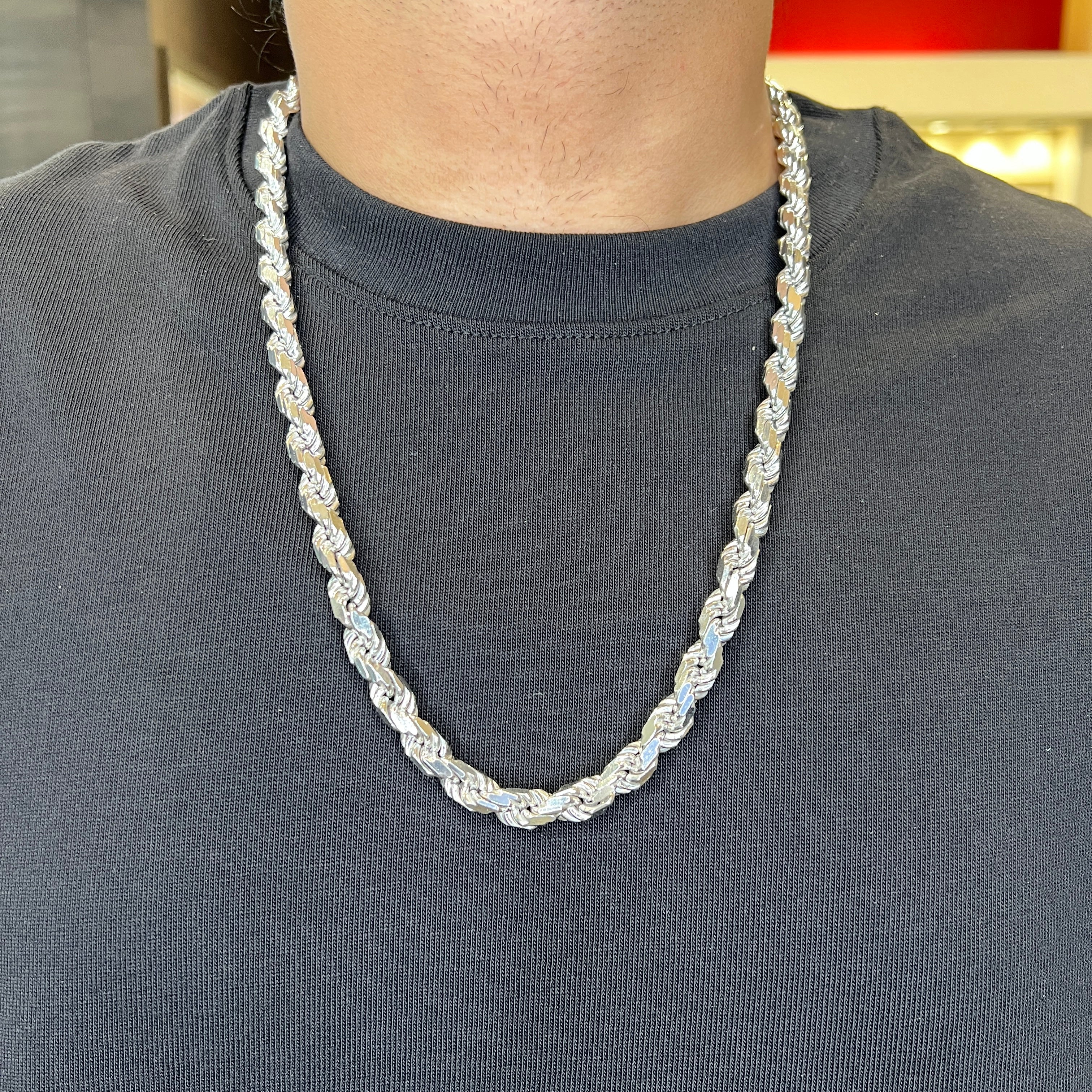 Bold and brilliant, this 8.0mm solid rope chain in sterling silver brings serious shine. The diamond-cut design catches the light from every angle—chunky, classic, and built to stand out. Wear it solo or stack it for max impact.
